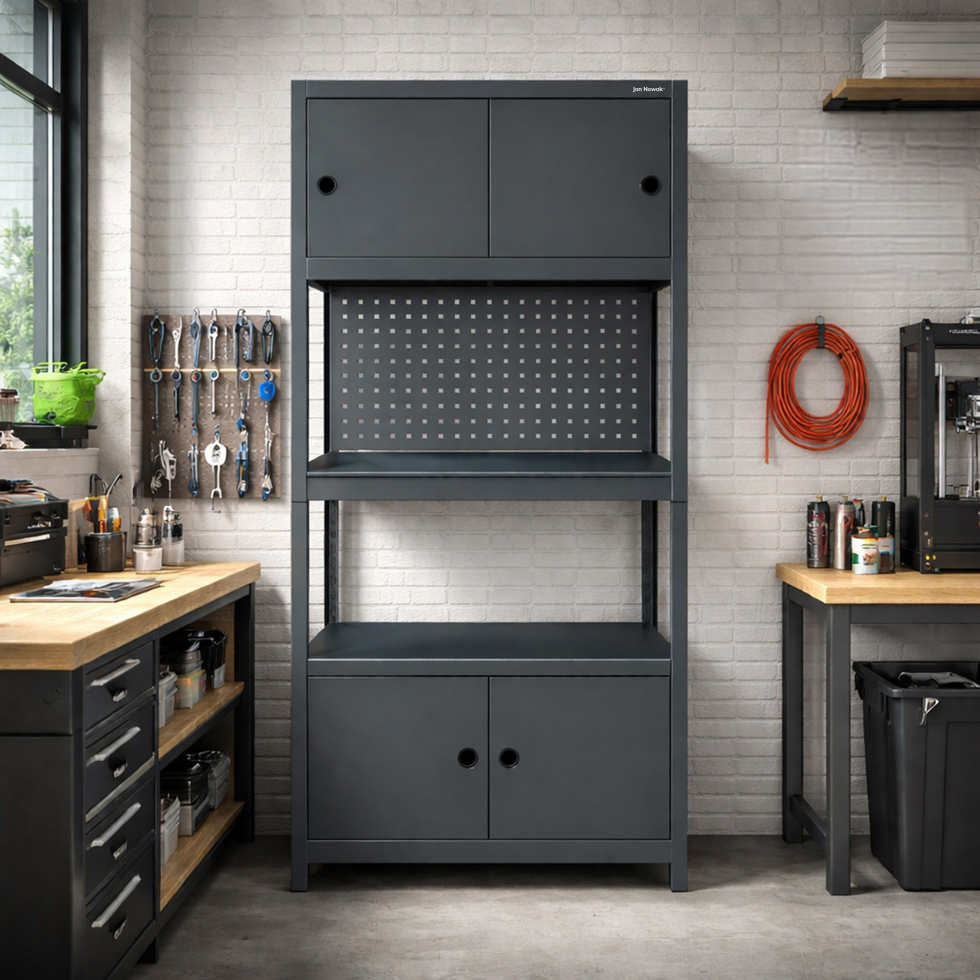 Kovový regál se skříňkami JOHNNY je navržen tak, aby umožňoval pohodlnou a efektivní segregaci nástrojů a příslušenství, a tím výrazně podporoval vaši produktivitu. Skvěle se osvědčuje nejen ve velkých dílnách a skladech, ale také v menších garážích, sklepích a hobby místnostech. S regálem JOHNNY získáte konečně přehled a systém ve svém pracovním prostoru.
