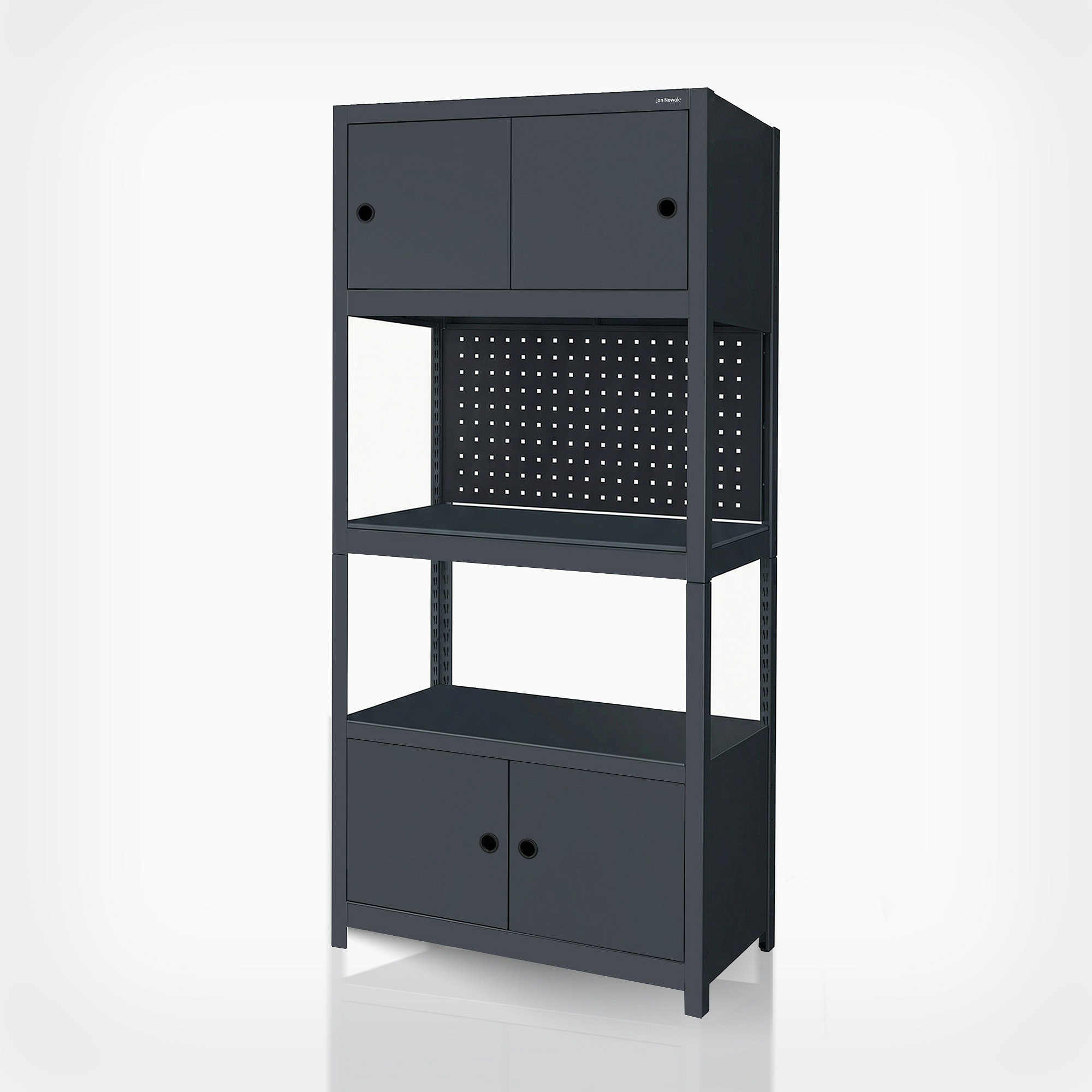Antracitový regál JOHNNY je navržen tak, aby optimálně využíval dostupný prostor ve vaší dílně. Jeho promyšlené rozměry poskytují dostatek místa pro uložení veškerého dílenského nářadí, aniž by přitom zbytečně zahlcoval místnost. V jednom praktickém kusu nábytku se spojují hned tři typy úložného prostoru – otevřené police, uzavřené skříňky a tabule na doplňky. To usnadňuje seskupení všech potřebných věcí a rychlé nalezení toho, co právě potřebujete.