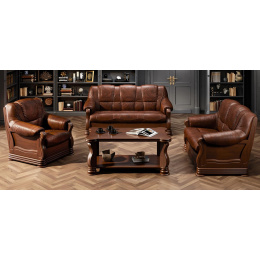 Rustikální kožená sedací souprava 3+2+1 je čalouněná pravou kůží. Možno dokoupit také taburet. Korpus je vyroben kombinací dřevotřísky a masivního dřeva. Výplně sedáku i opěry u sedací soupravy je kvalitní polyuretanová pěna. Dřevěné masivní prvky jsou mořené a lakované několikanásobnou vrstvou bezbarvého laku. Lze i jednotlivě. Pohovka 3 lze za doplatek s rozkladem ke spaní.
