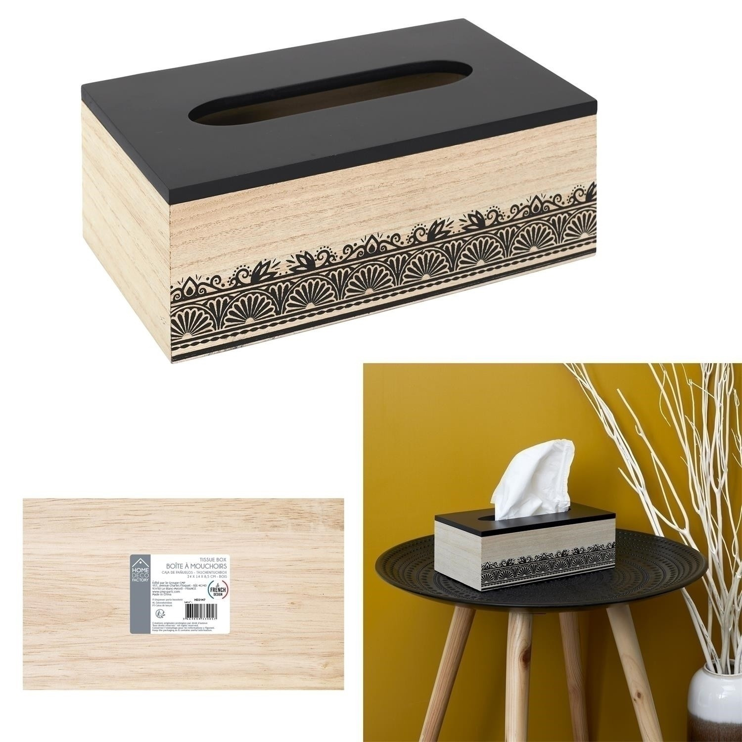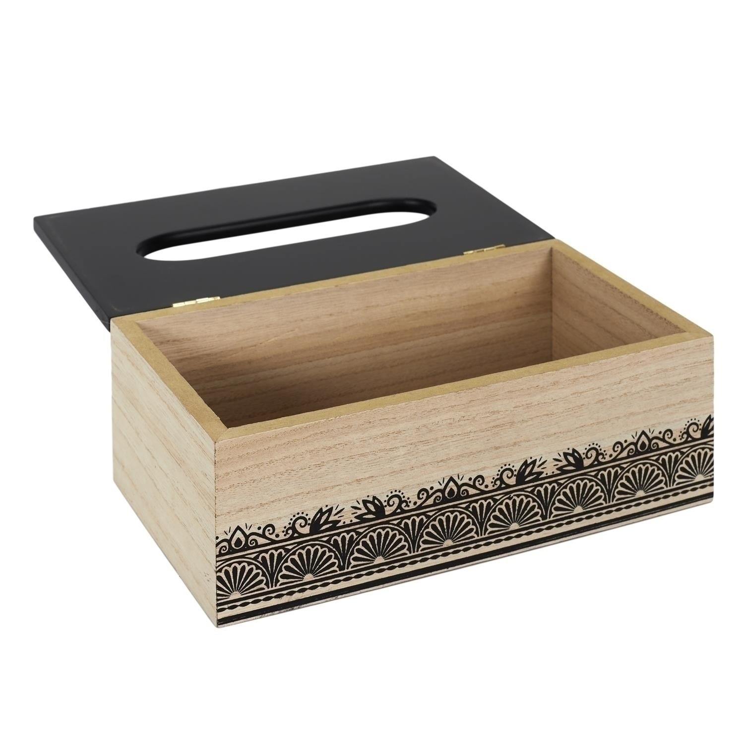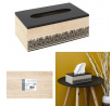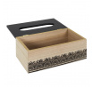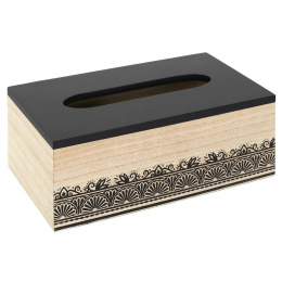 Krabička na kapesníky je nezbytností každé domácnosti. Díky takové krabičce můžeme zajímavým způsobem uchovávat kapesníky, které jsou obvykle v málo zajímavých krabičkách. Krabička v barvě dřeva a jemně zdobená zespodu je navíc zajímavým prvkem interiéru. V krabičce můžeme uchovávat nejen kapesníky, ale také jednorázové sáčky nebo drobnosti. Krabice vyrobená z MDF desky zdobené černým lakem.