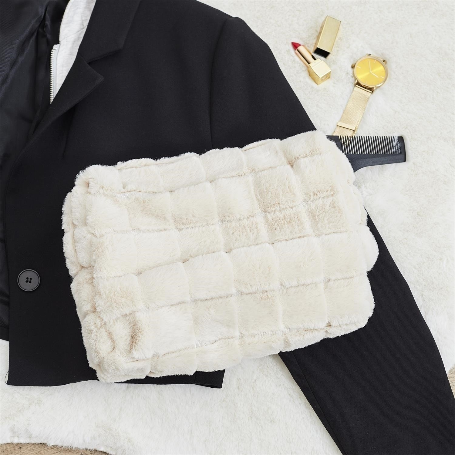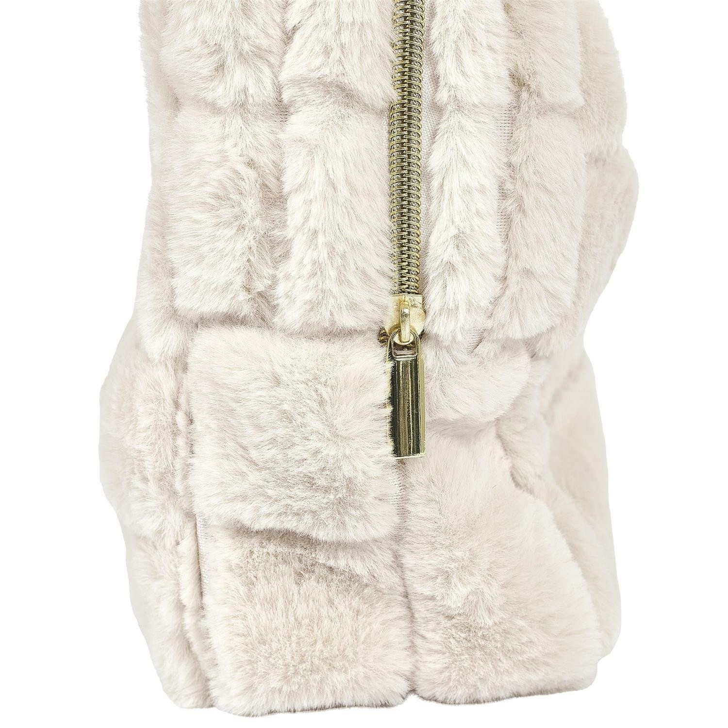 Stylová a elegantní kosmetická taštička v krémové barvě, vyrobená z měkké kožešiny, která jí dodává výjimečný, luxusní vzhled. Ideální pro ukládání kosmetiky, doplňků a drobných předmětů. Kompaktní, a přitom prostorná, ideální pro každodenní použití i na cesty. Díky svému jemnému designu bude skvělým doplňkem každého outfitu.