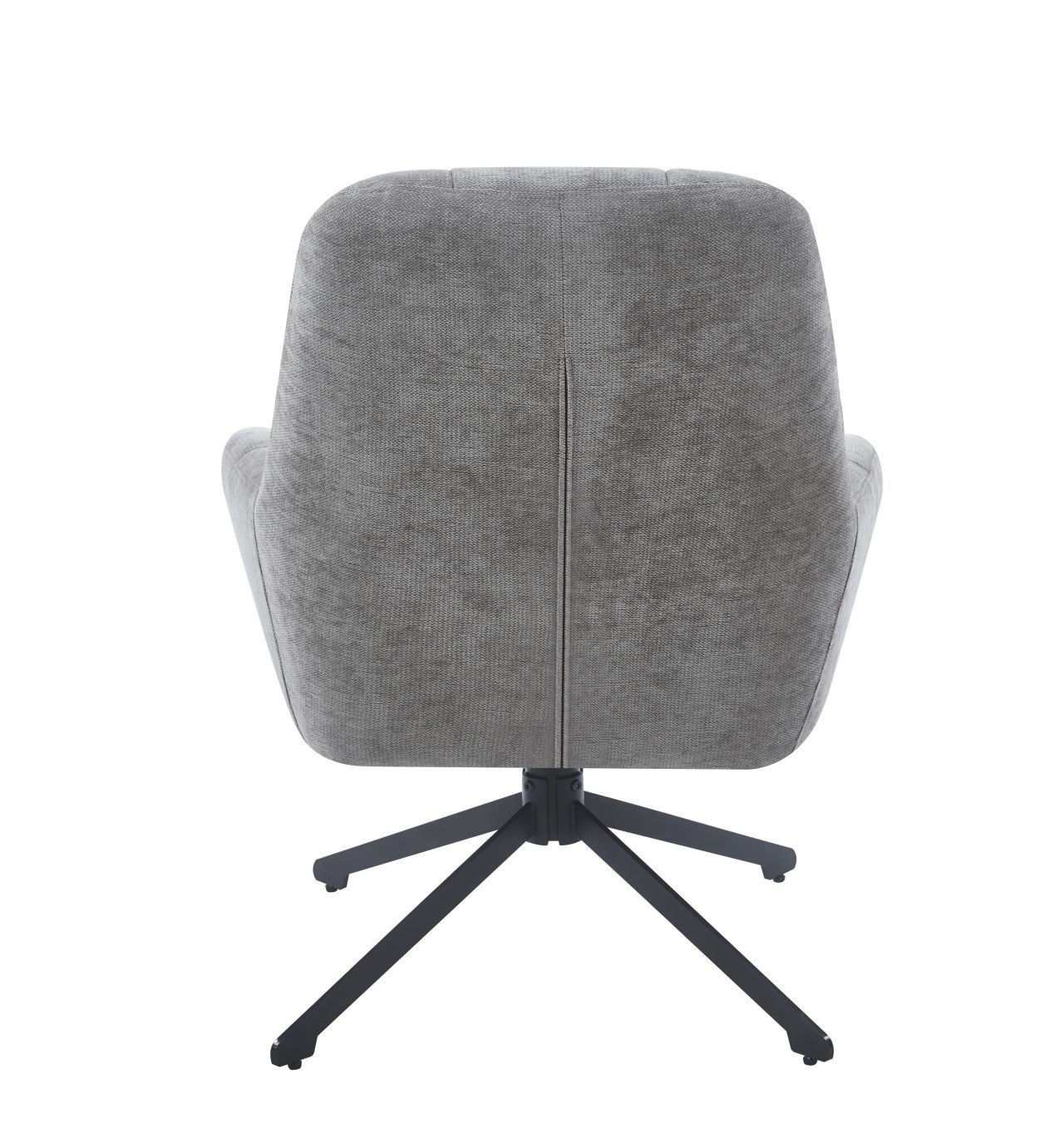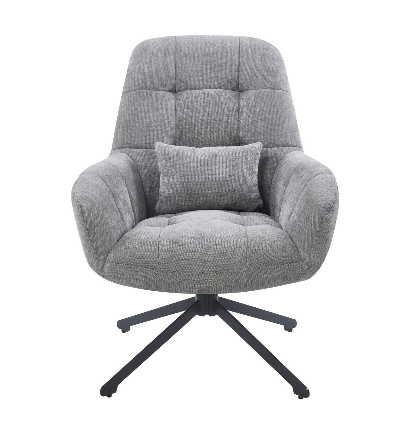 Křeslo má sedák otočný v rozsahu 360 stupňů Rozměry: - šířka sedáku: 48 cm - celková šířka: 71 cm - výška sedáku: 50 cm - celková výška: 95 cm - hloubka sedáku: 51 cm - polštář: 31x21 cm Materiál - čalounění: látka Holms - rám: kov lakovaný práškovou barvou Barva: - čalounění: šedá - rám: černá Další: - otočný sedák - polštář
