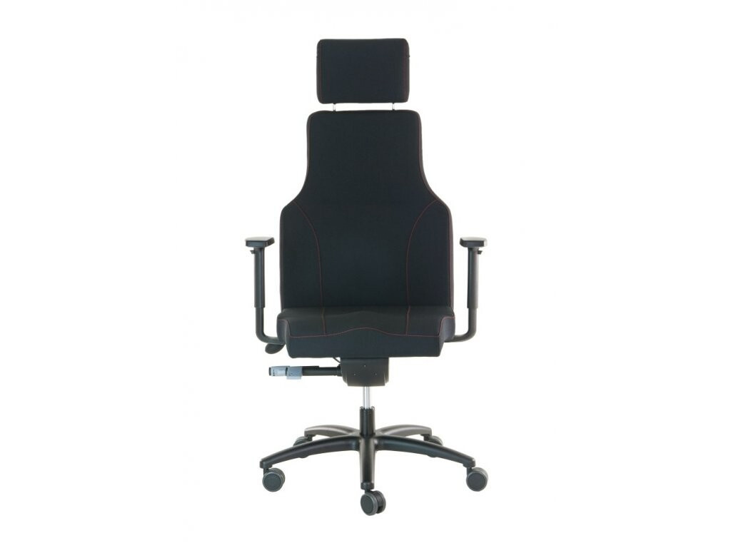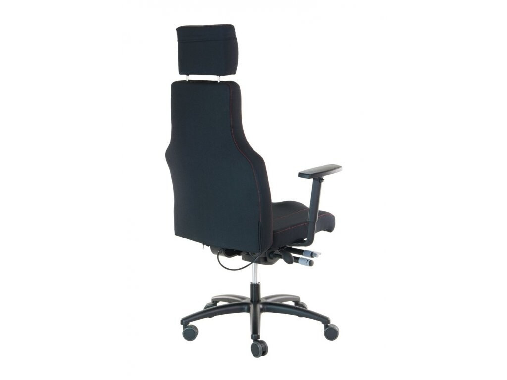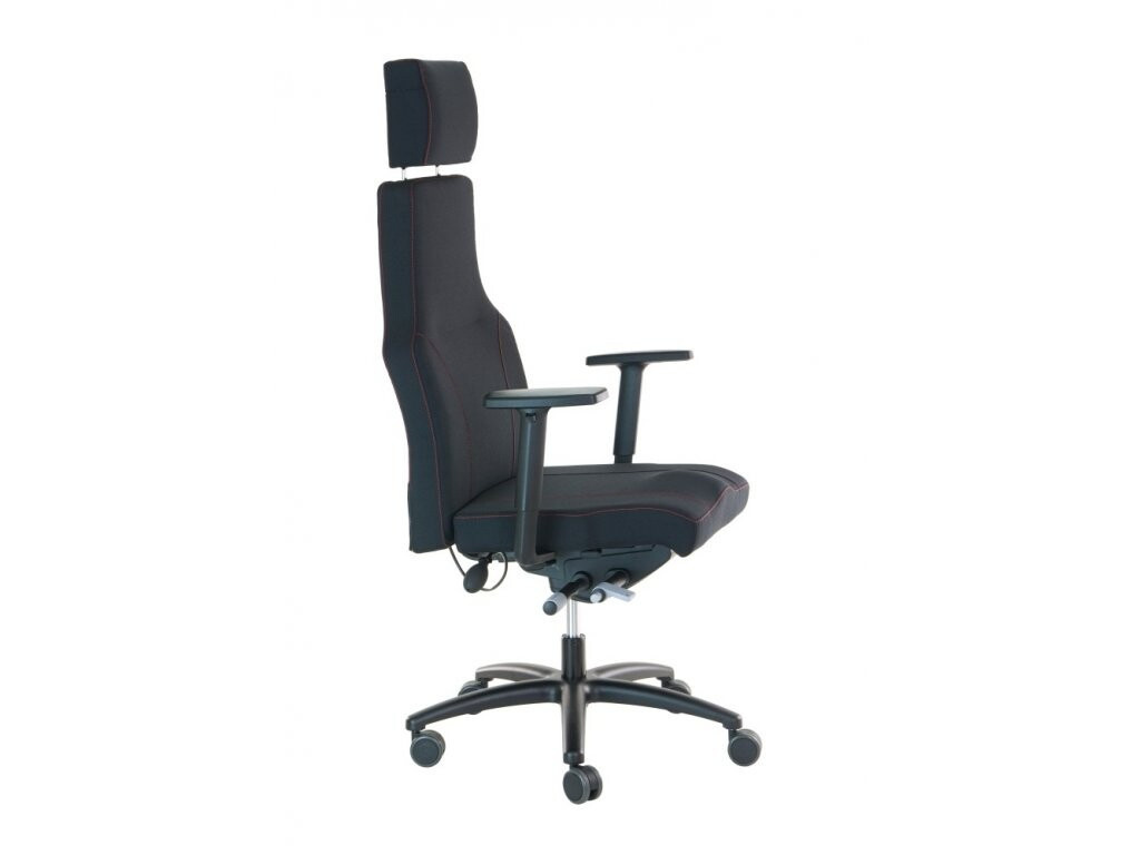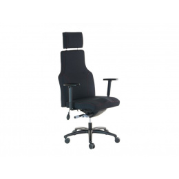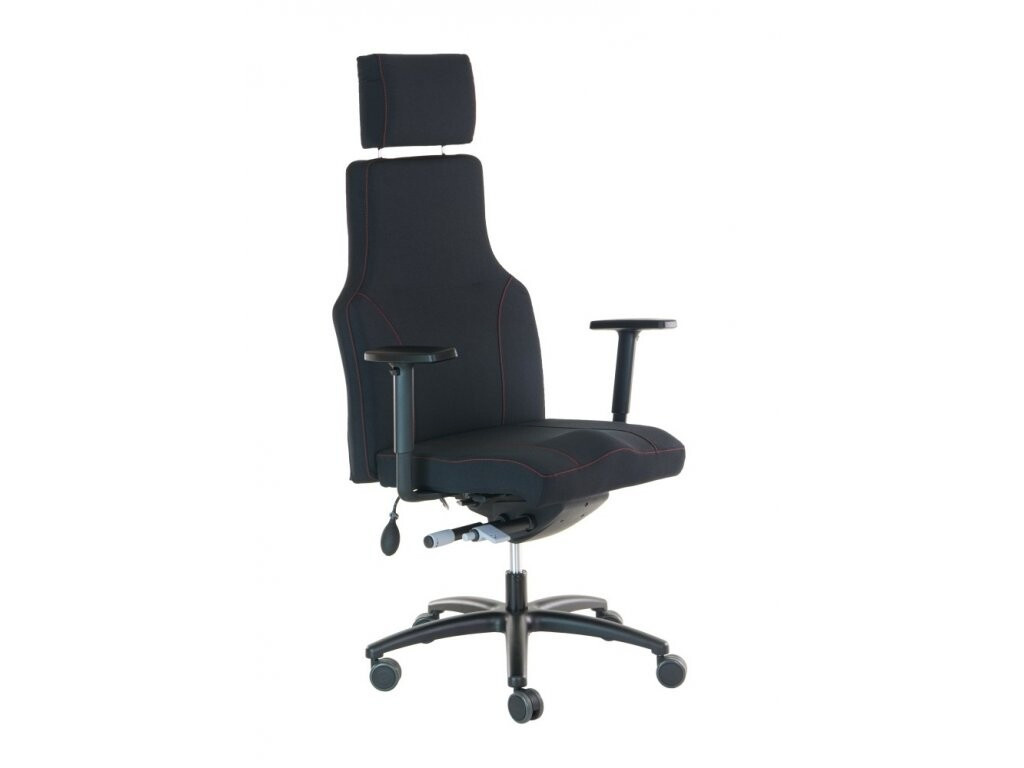 Kvalitní ERGO 24 je velmi robustní zátěžové křeslo vhodné pro nepřetržité provozy 24/7. Je očalouněno v černém vysokozátěžovém potahu Lucky, designové prošití červenou nití. Základem je kvalitní synchronní mechanika pro extrémní namáhání, která umožňuje blokaci opěráku v 5 polohách, posuv a negativní náklon sedáku. Mechanika má komfortní boční nastavení tuhosti přítlaku zad dle váhy uživatele. Součástí vysokého a bohatě čalouněného opěráku je vzduchově nastavitelná bederní opěra a 3D nastavitelný čalouněný podhlavník. Stabilní základnou křesla ERGO 24 je černý hliníkový kříž s univerzálními pogumovanými kolečky o průměru 65 mm. Podporu pro ruce poskytují výškově nastavitelné područky s měkčeným polyuretanovým topem.