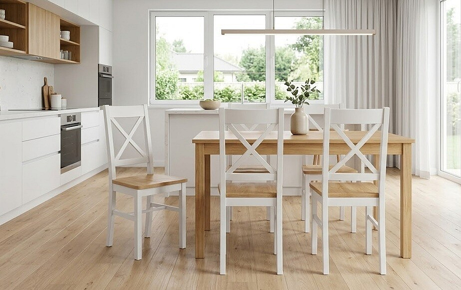 Materiál: Jídelní židle Cross je vyrobena z kvalitního dřeva a tkaniny, což zajišťuje její pevnost a odolnost. Dřevěná konstrukce je dostupná v elegantní kombinaci bílé a bukové barvy, která se snadno sladí s jakýmkoli interiérem. Tkanina použitá na sedáku je nejen příjemná na dotek, ale také snadno udržovatelná, což oceníte zejména při každodenním používání.