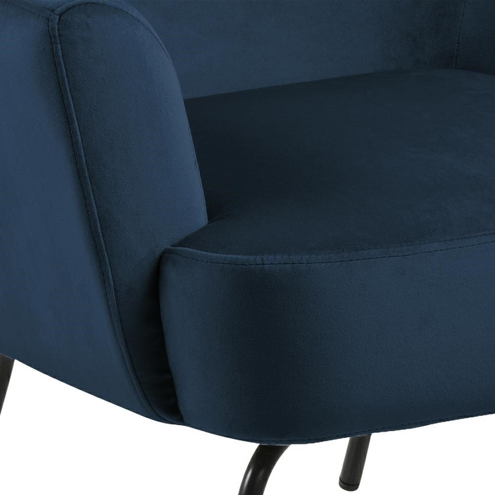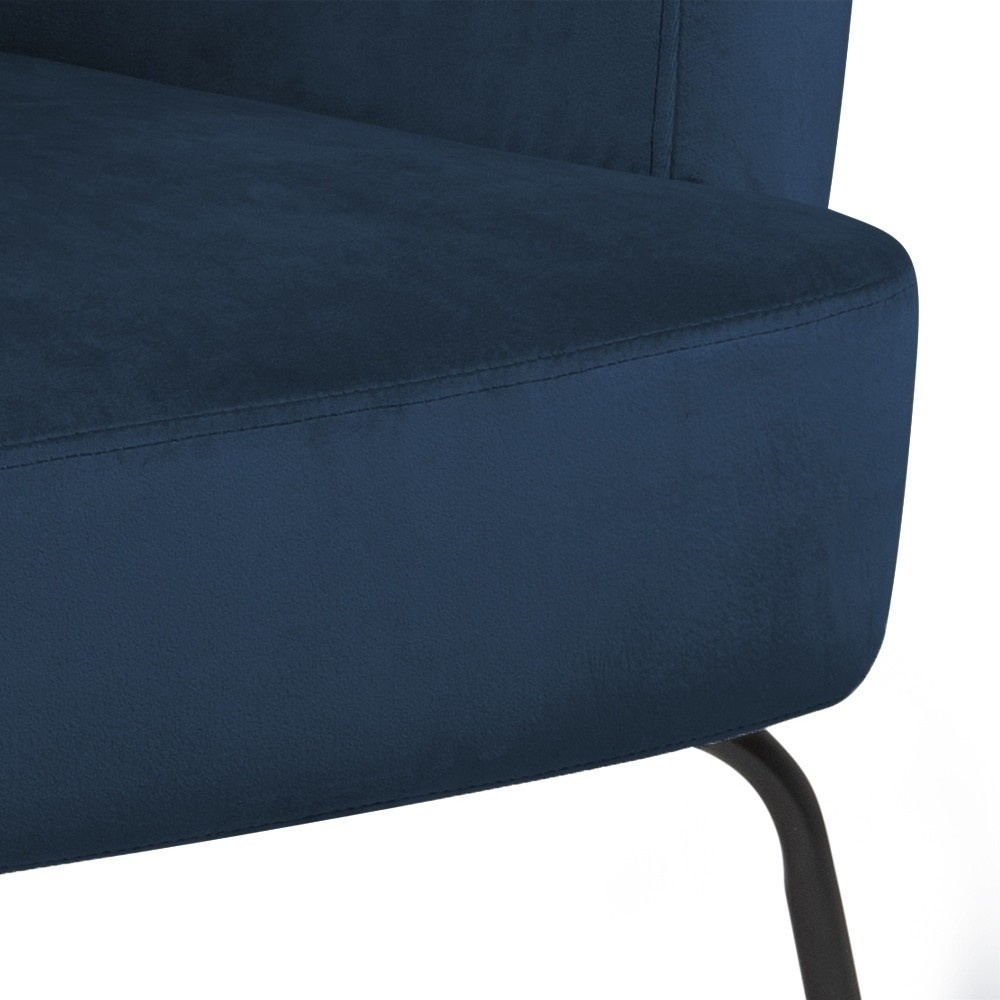 Křeslo Felissa je elegantní nábytek ve stylu glamour. Čtyři kovové, práškově lakované nohy jsou zespodu opatřeny speciálními krytkami. Sedák a opěradlo jsou vyrobeny z polyuretanové pěny. Křeslo je čalouněné příjemnou na dotek látkou VIC fabric navy blue 66. Má pohodlné opěrky na ruce. Křeslo Melissa je ideální do obývacího pokoje nebo čekárny v kanceláři. Rozměry: 75x75x83 cm Hmotnost: 12 kg