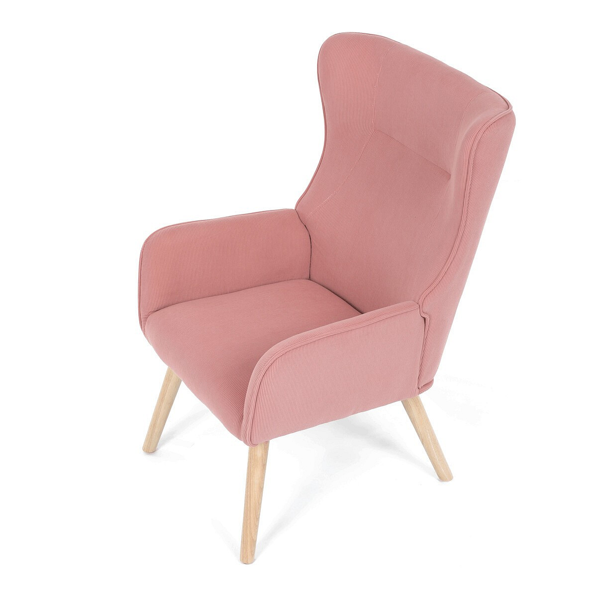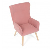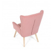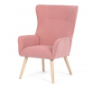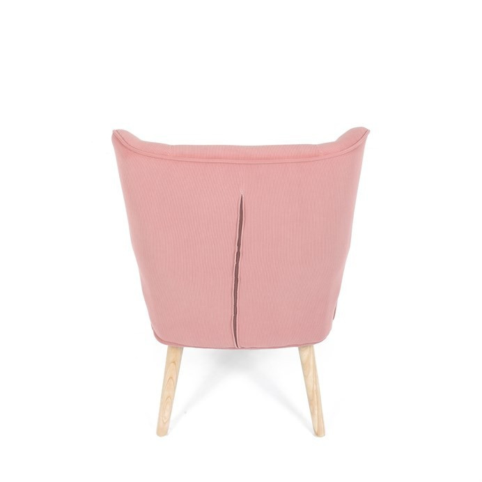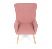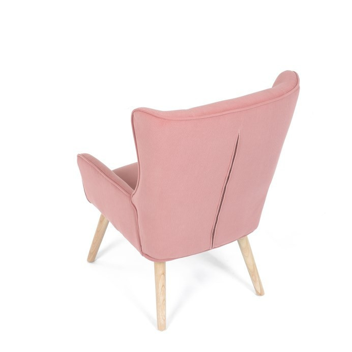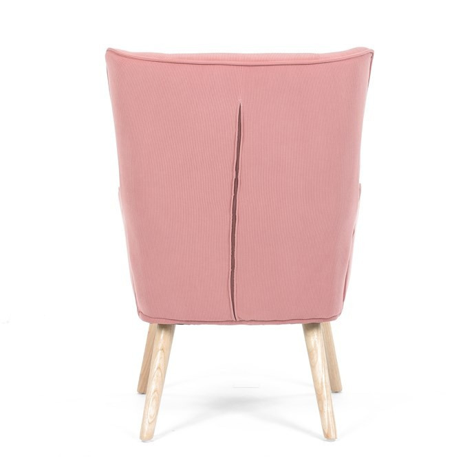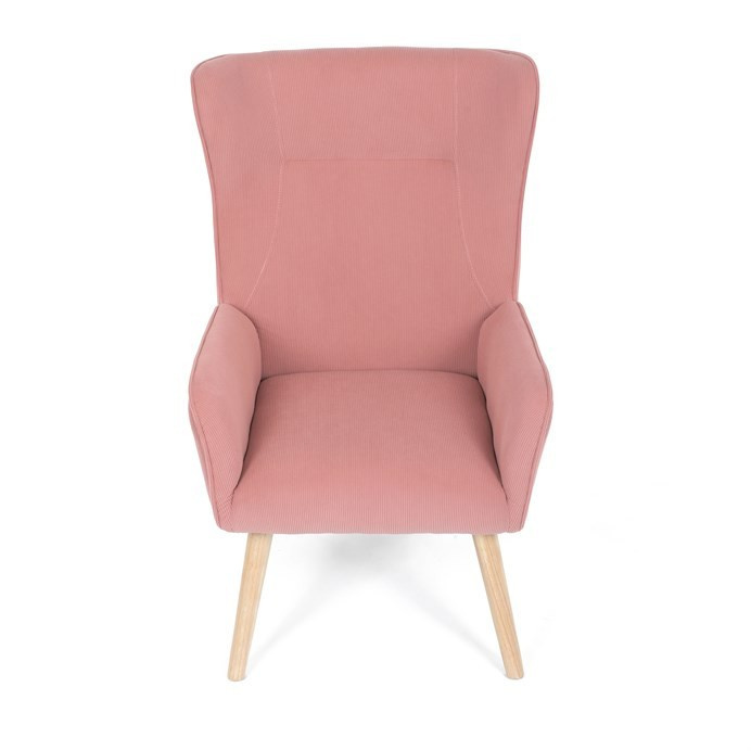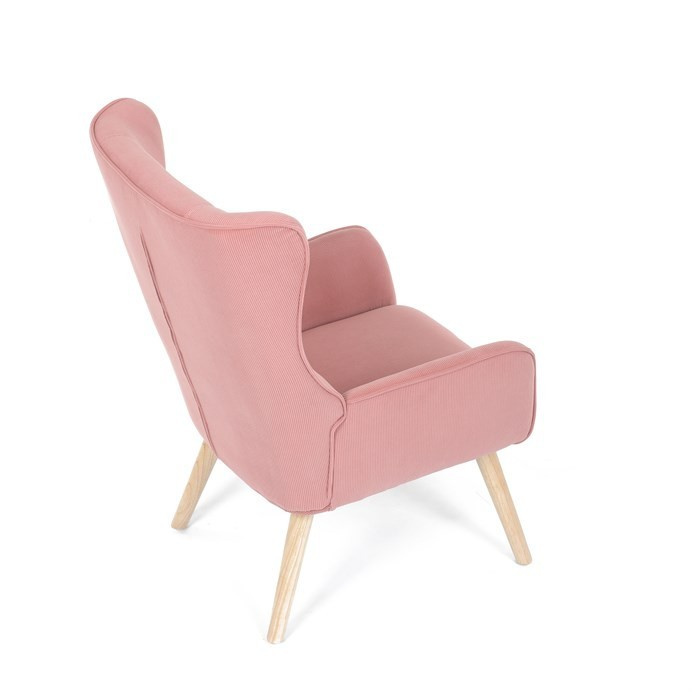 Křeslo s označením ušák je potažené růžovou manšestrovou látkou, která nabízí příjemnou texturu a vizuální efekt. Sedák i opěradlo jsou tvarované pro pohodlné opření těla, přičemž vysoké opěradlo s křídly poskytuje podporu hlavy a ramen. Masivní nohy z kaučukovníku zajišťují stabilitu a pevnost celého křesla, přičemž jejich přírodní odstín ladí s jemným tónem potahu. Díky pevnému provedení a kvalitnímu materiálu je křeslo vhodné pro relaxaci v obývacím pokoji nebo čtecím koutě.