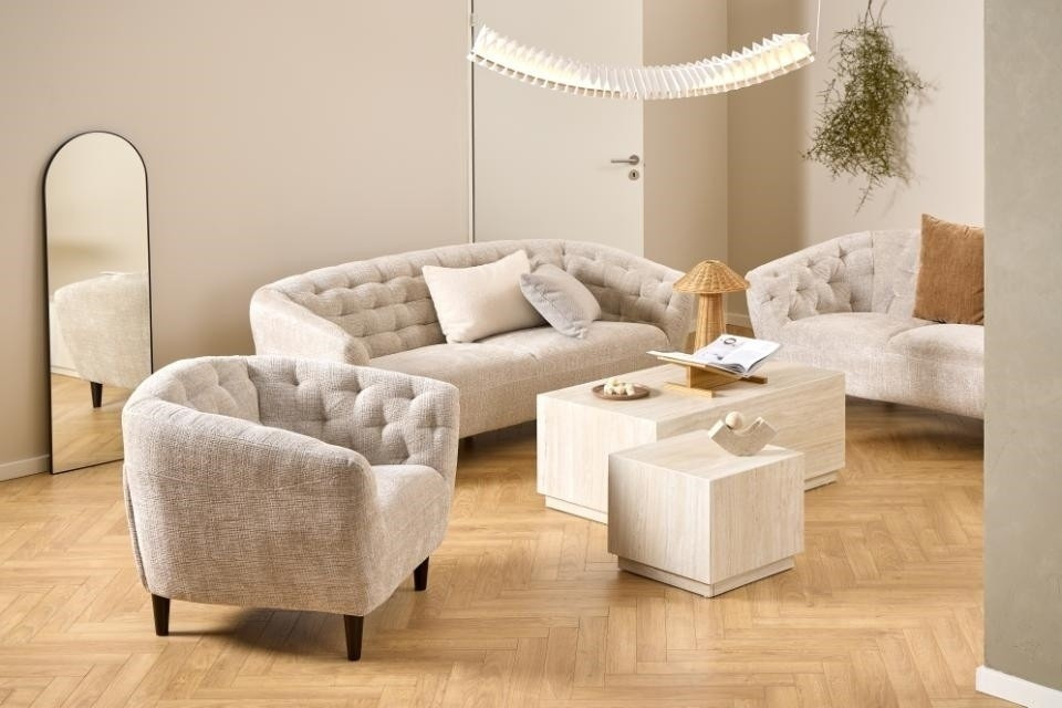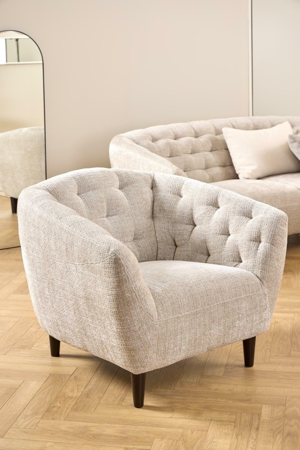 Béžové křeslo RIA s oblým tvarem je plné stylu. Jeho texturovaný povrch poskytuje jemné pocity a kapsové pružiny zajišťují vysoký komfort, čímž zvyšují zážitky v obývacím pokoji. Od ženského prošívání po kulaté, směrem dolů se zužující černé nožky, tento nábytek vyzařuje klasickou estetikou. Elegantní jednosedadlové křeslo s klasickou estetikou. Béžová, texturovaná tkanina s měkkým, živým povrchem. Tuftované detaily dodávají texturu a ženský charakter. Výška opěradla 45 cm Šířka sedáku 57 cm Hloubka sedáku 55 cm Maximální výška sedáku. 46 cm Šířka područky 12 cm Hloubka područky 68 cm Výška područky 42 cm Max. zatížení 110 kg