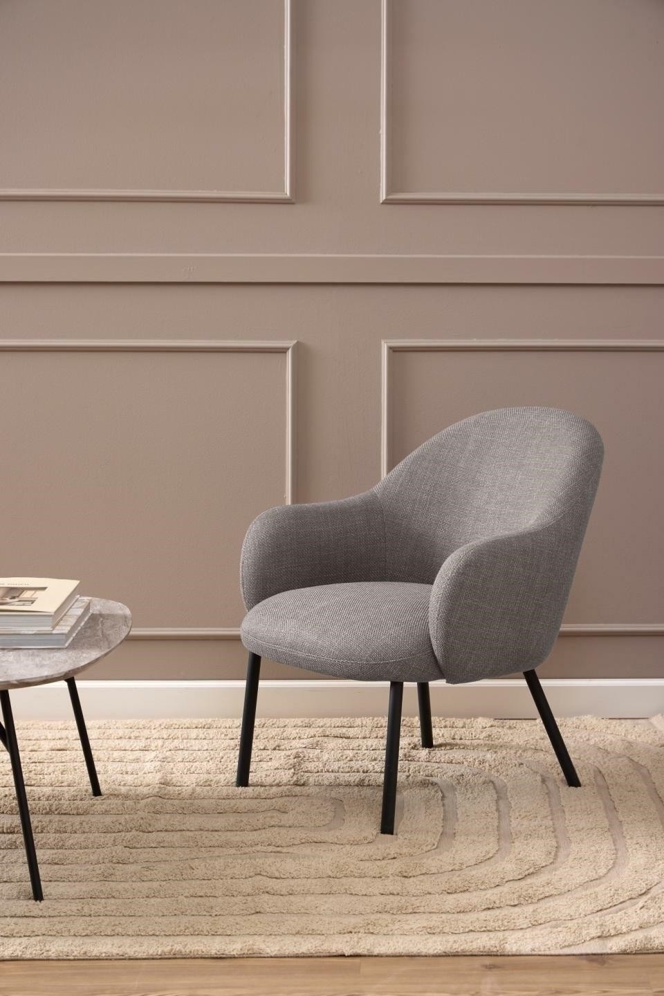 Křeslo Spencer se vyznačuje neobvyklým tvarem. Čalouněné sedadlo, připomínající bublinu, se vyznačuje zaoblenou siluetou, která je pokryta hrubě tkanou látkou. Stojící na kulatých černých nohách, křeslo je stabilní a dobře se hodí k různým stylům interiérů od boho, japandi přes skandinávský až po moderní glamour. Elegantní odpočinkové křeslo s jednoduchou a kulatou siluetou. Kulaté ocelové nohy v černé barvě s matným práškovým lakováním. Výška opěradla: 36 cm Šířka sedáku: 53 cm Hloubka sedáku: 52 cm Výška područek od podlahy: 56,5 cm Výška područek od sedáku: 16 cm Vyžaduje montáž. Max. zatížení 110 kg Rozměry kartonu: 74x69x56 cm