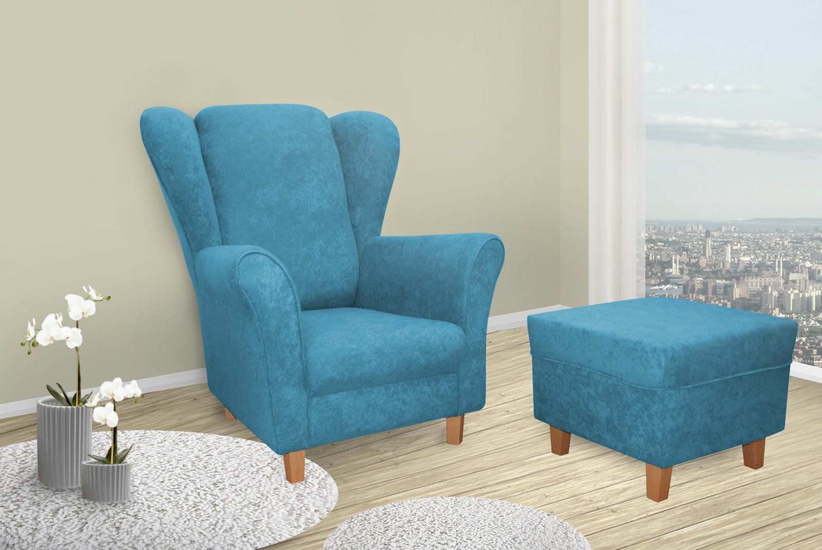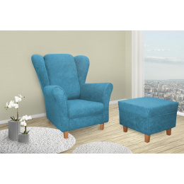 Pohodlné křeslo s taburetem se skvěle hodí nejen do obývacího pokoje, ale také i do pracovny. U křesla oceníte především vysokou opěrku hlavy a taburet vám poskytne skvělý odpočinek pro nohy. Křeslo i taburet je očalouněn kvalitní potahovou látkou Alova v barevném provedení nebeská modř. Nohy jsou vyrobeny ze dřeva.