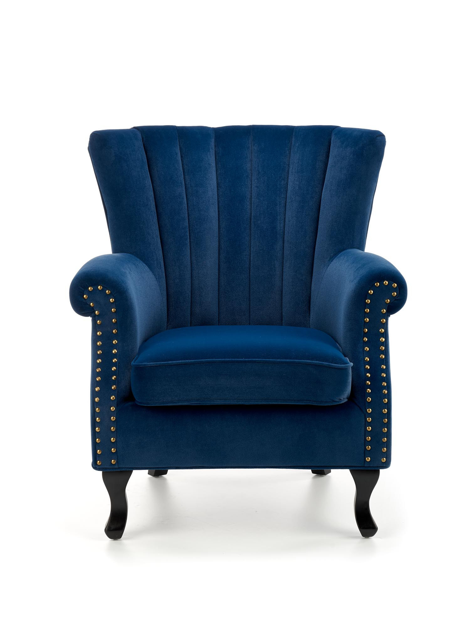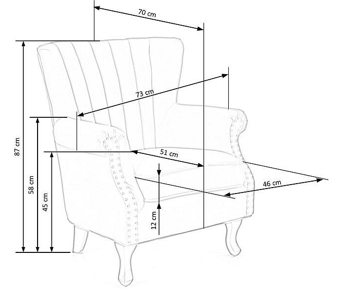 Dominantním prvkem je vysoké opěradlo s dekorativním svislým prošíváním, které zajišťuje optimální oporu zad a zároveň podtrhuje elegantní vzhled. Pohodlné područky jsou zdobené jemnými kovovými cvočky, které dodávají křeslu lehce retro nádech a činí z něj nepřehlédnutelný designový prvek. Sedák je dostatečně široký a měkký, což zaručuje maximální komfort při sezení, ať už při odpočinku, čtení knihy nebo sledování televize.