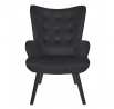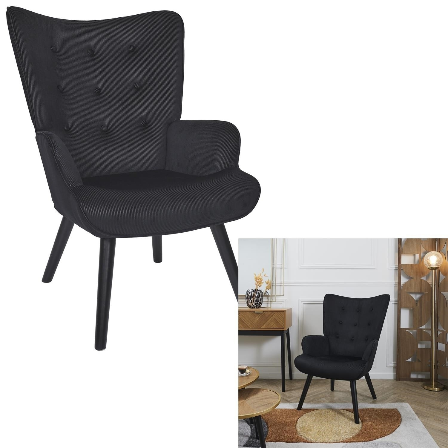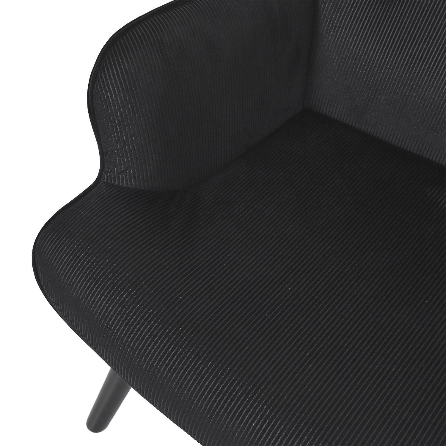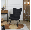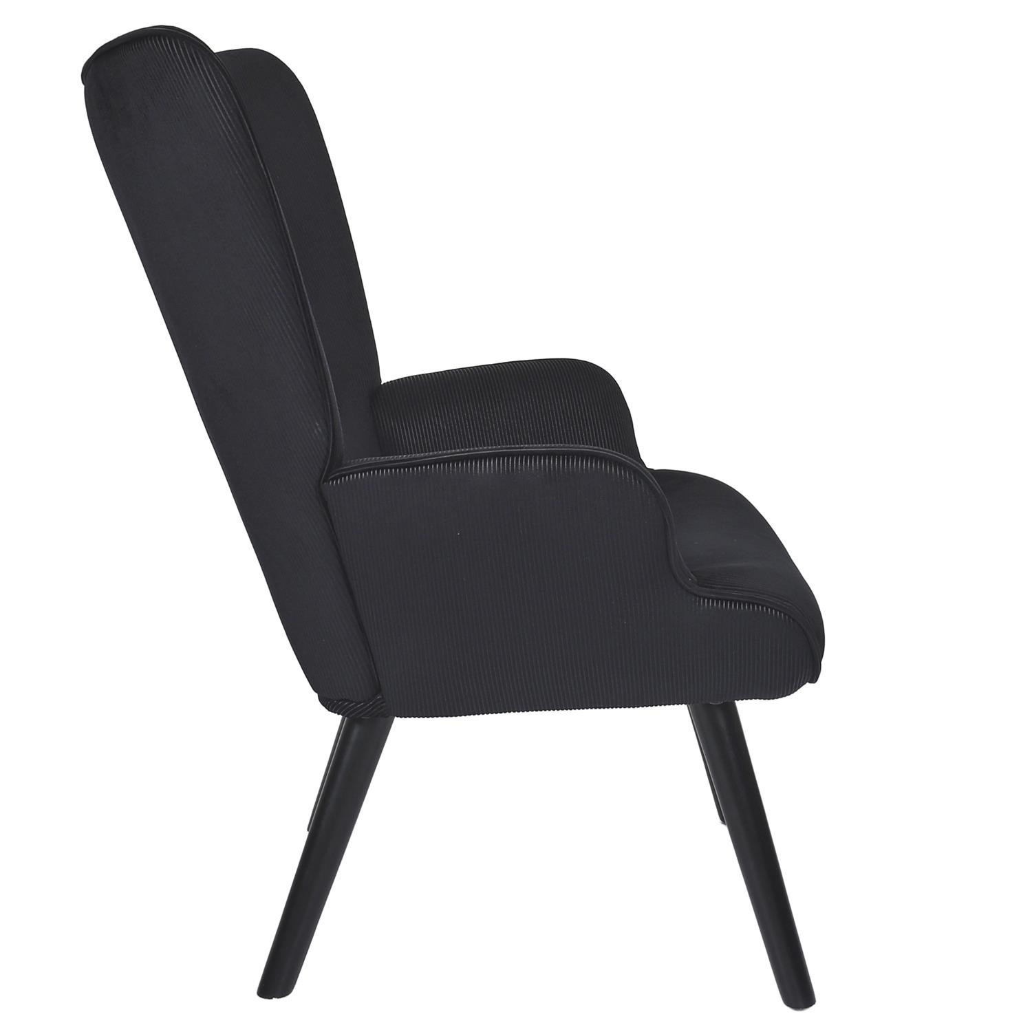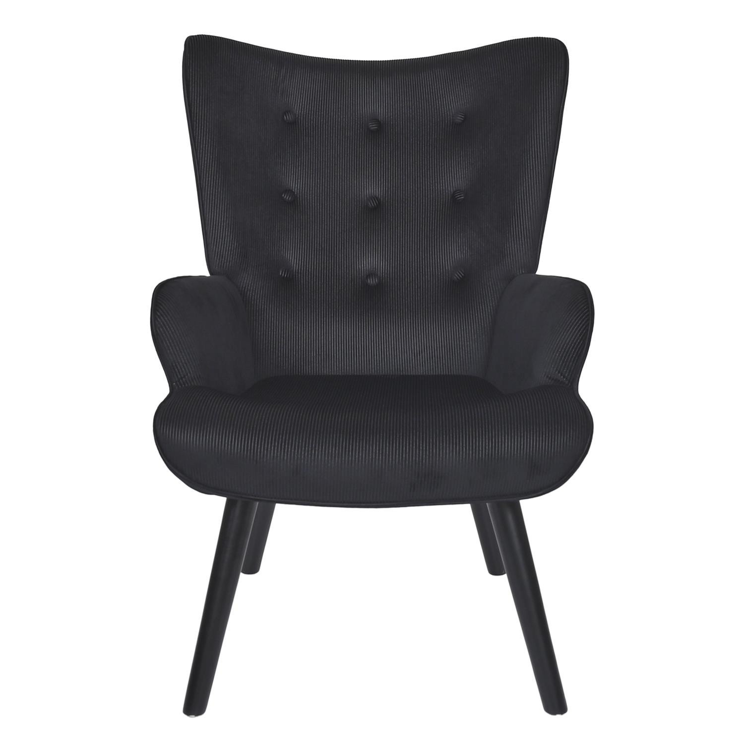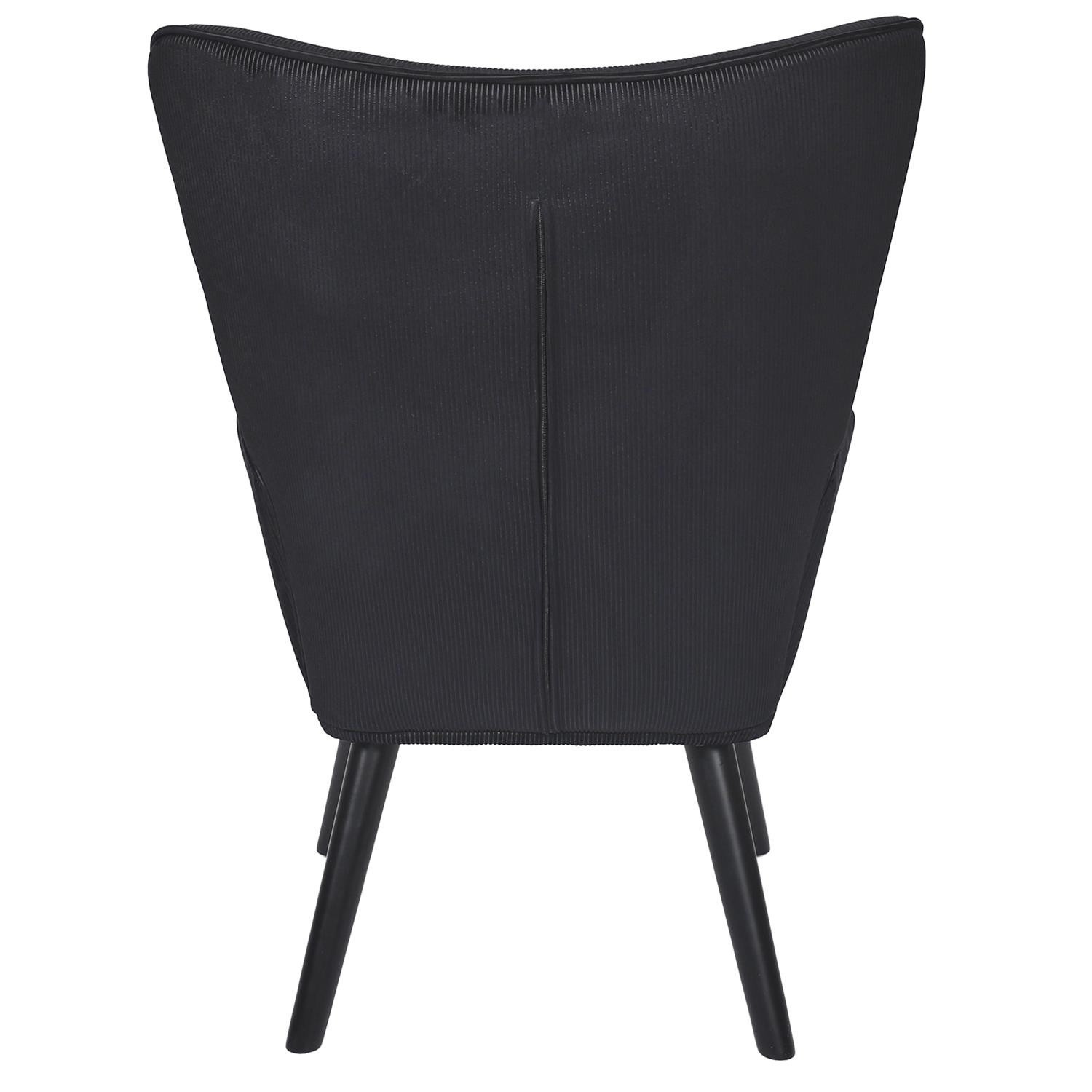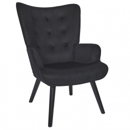 Pohodlné křeslo ušák v černé, manšestrové látce je nábytek jak pro klidný odpočinek, tak pro čtení knih nebo kojení. Křeslo s nízkým sedákem a hlubokým opěradlem zaručuje klid a pohodlí. Křeslo na dřevěných, točených, kaučukových nožkách v černé barvě se ideálně hodí do interiérů v moderním, loftovém i skandinávském stylu. Ozdobná, manšestrová tkanina vyrobená ze 100% polyesteru byla ozdobena knoflíky na opěradle. Křeslo váží 9 kg. Max. zatížení křesla 120 kg. Vyžaduje snadnou montáž (přišroubování nohou). Nestohuje se. Není vhodné pro venkovní použití. Tloušťka pěny na sedáku 24 kg/m3. Tloušťka pěny na opěradle: 18kg/m3