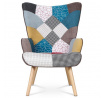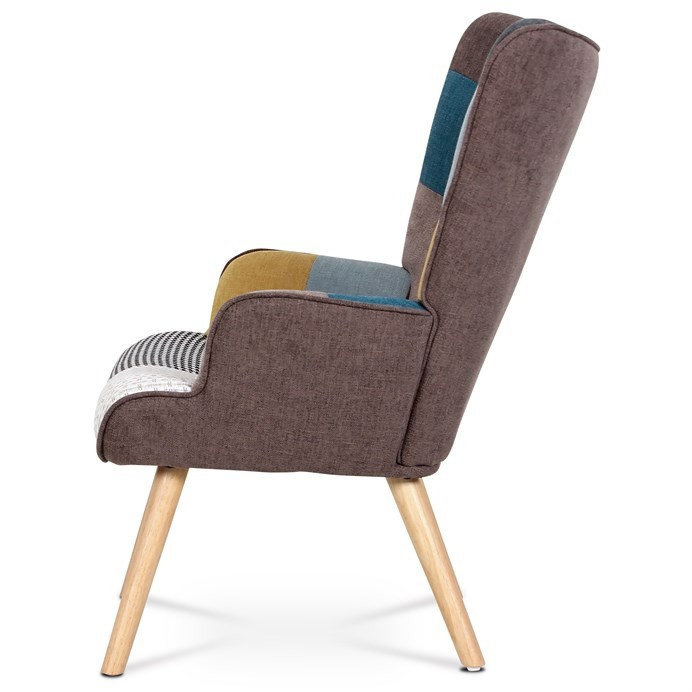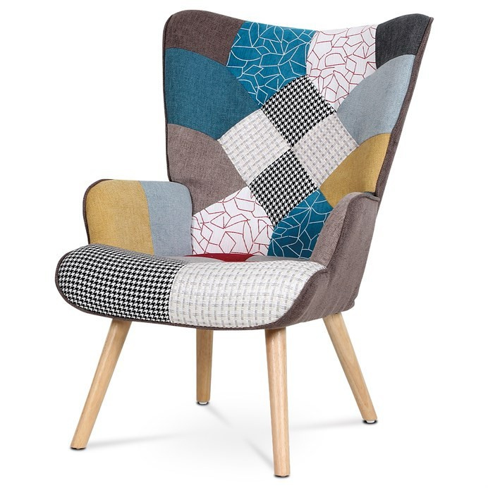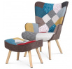 Křeslo ušák s podnožkou vyniká výrazným patchwork potahem z kvalitní látky, který kombinuje vícebarevné vzory a dodává interiéru osobitý charakter. Masivní nohy z kaučukovníku zajišťují stabilitu a dlouhou životnost, přičemž jejich přírodní odstín ladí s barevností čalounění. Ergonomicky tvarované opěradlo s vysokými bočními křídly poskytuje pohodlnou oporu pro záda i hlavu, což podporuje relaxaci. Součástí je také samostatný taburet s odpovídajícím designem, který umožňuje pohodlné podložení nohou. Křeslo je určeno pro použití v obývacích pokojích či relaxačních zónách, kde oceníte kombinaci komfortu a stylového provedení.