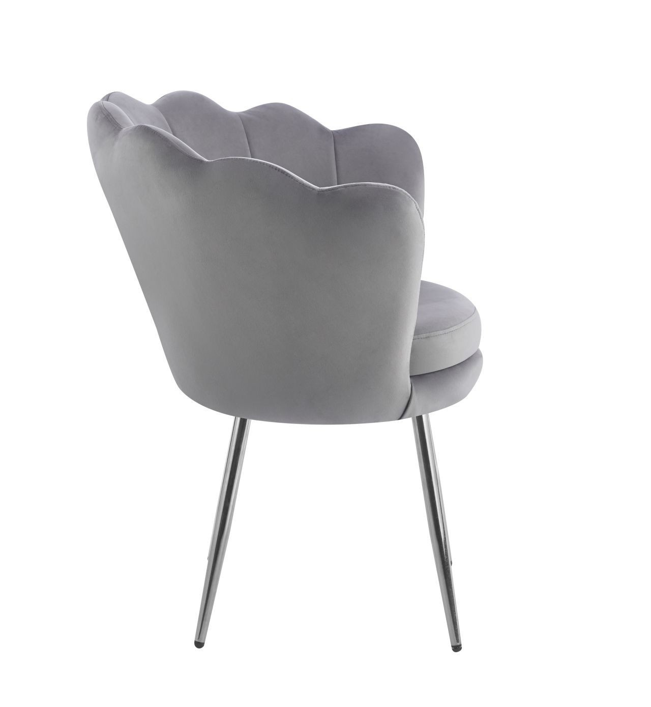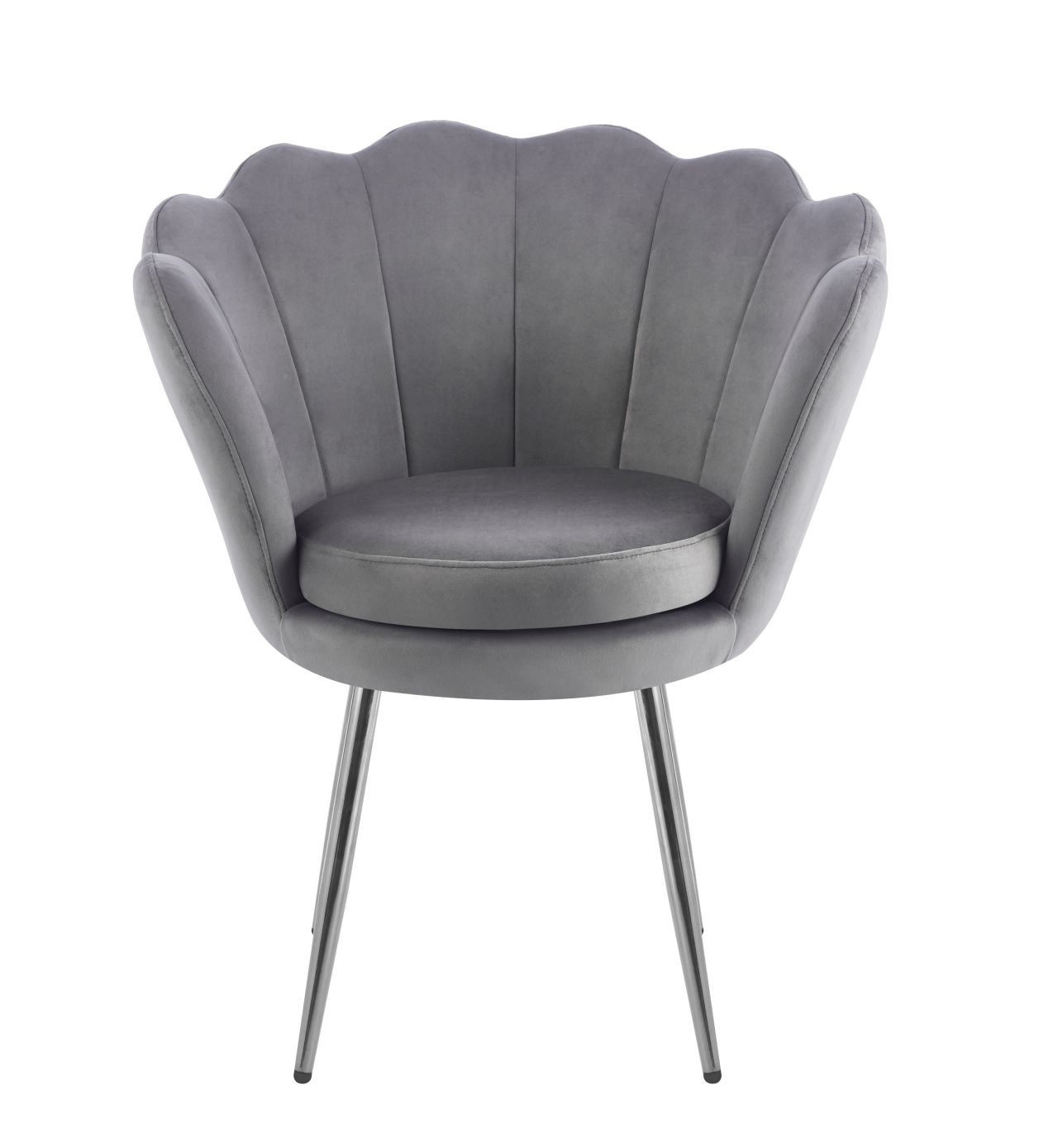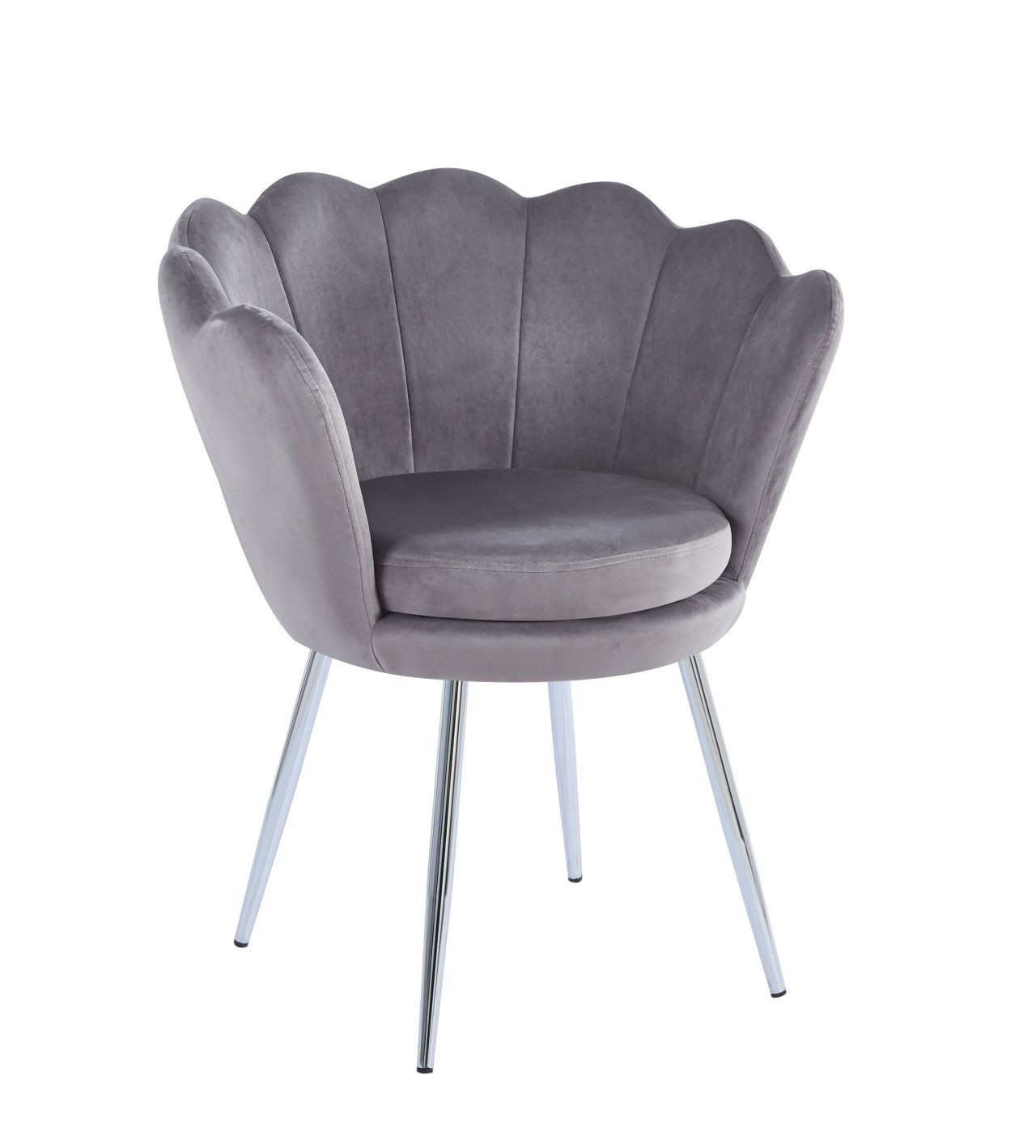 Rozměry: - celková výška: 77,50 cm - výška sedáku: 39,50 cm - výška opěradla: 37 cm - hloubka sedáku: 42 cm - šířka sedáku: 38 cm - celková šířka: 68 cm Materiál - čalounění: samet - nohy: chrom Barva: - sedák: šedá - nohy: stříbrné