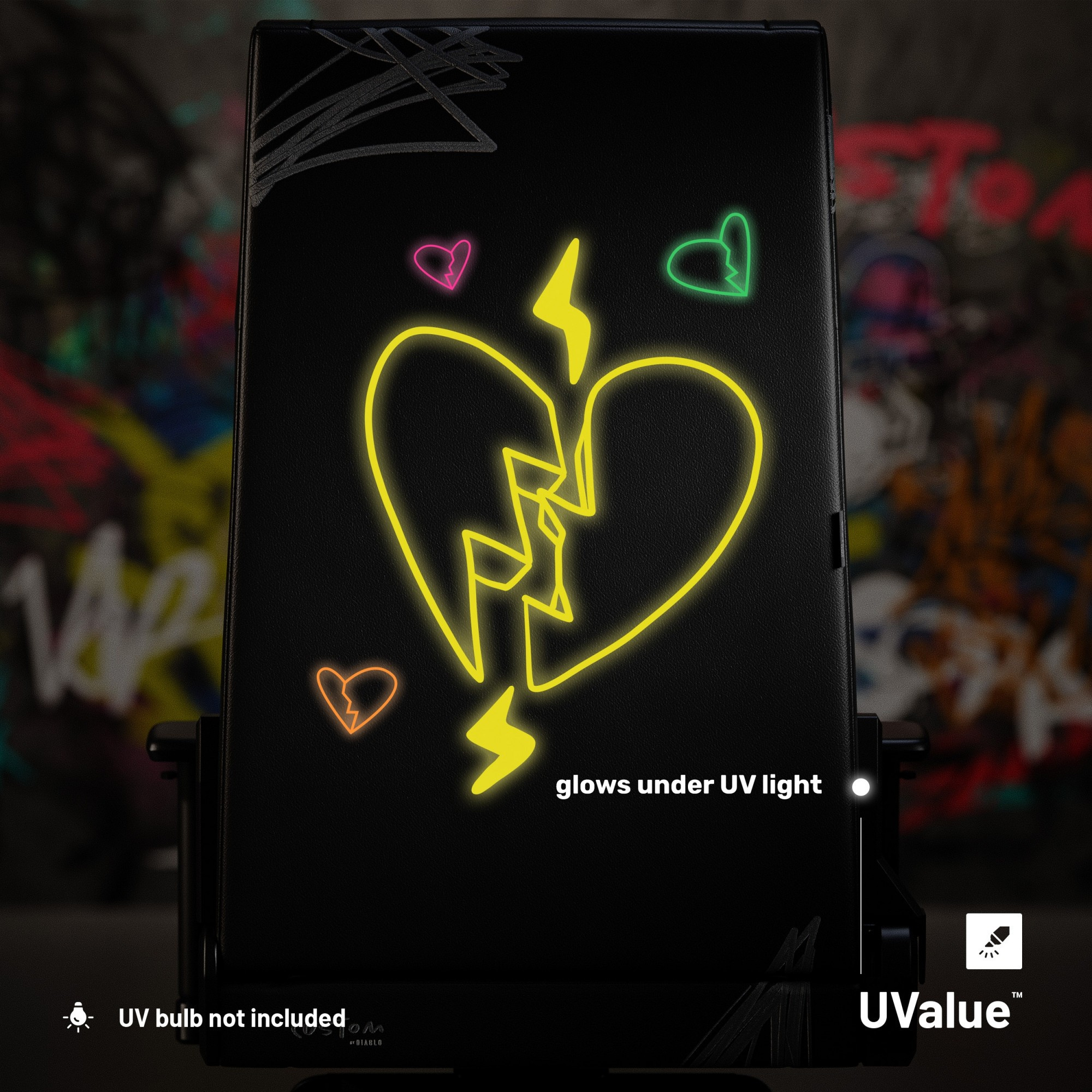 Představte si, jak vaše umělecké dílo ožívá pod UV světlem! Až 4 barvy v sadě jsou fluorescenční a okouzlí vás efektem UValue™. S UV lampou (není součástí balení) můžete vytvořit úžasnou světelnou show, která promění vaše křeslo v unikátní umělecké dílo.