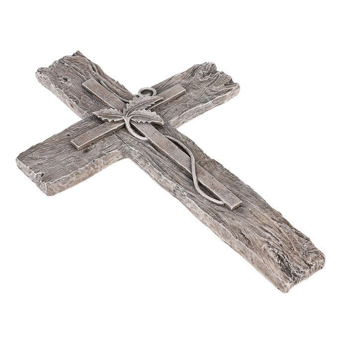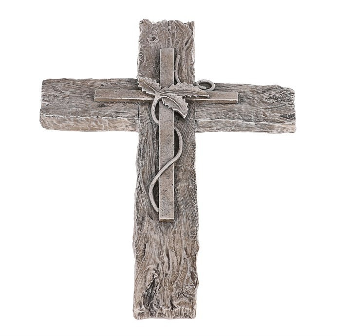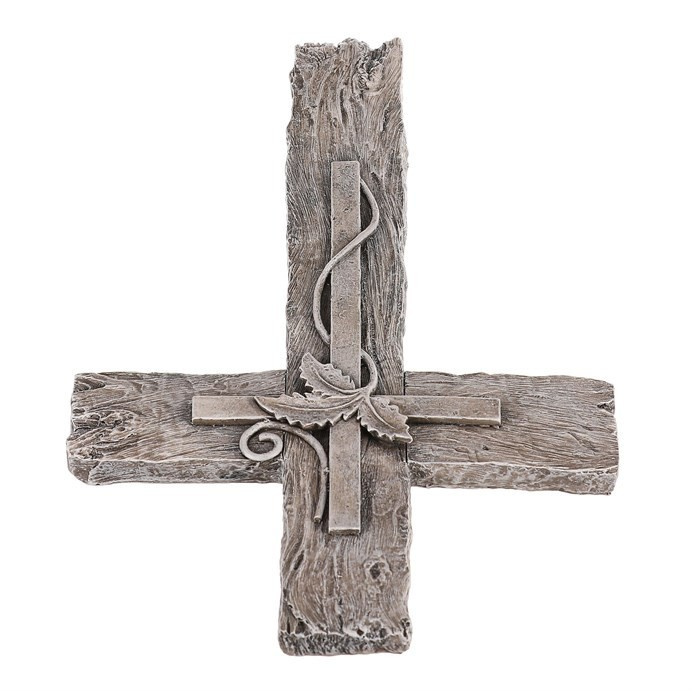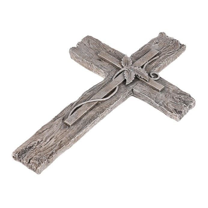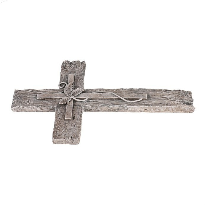 Kříž s lístky, imitace dřeva - polyresin, šedý