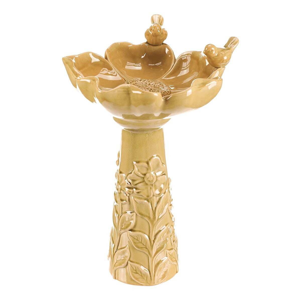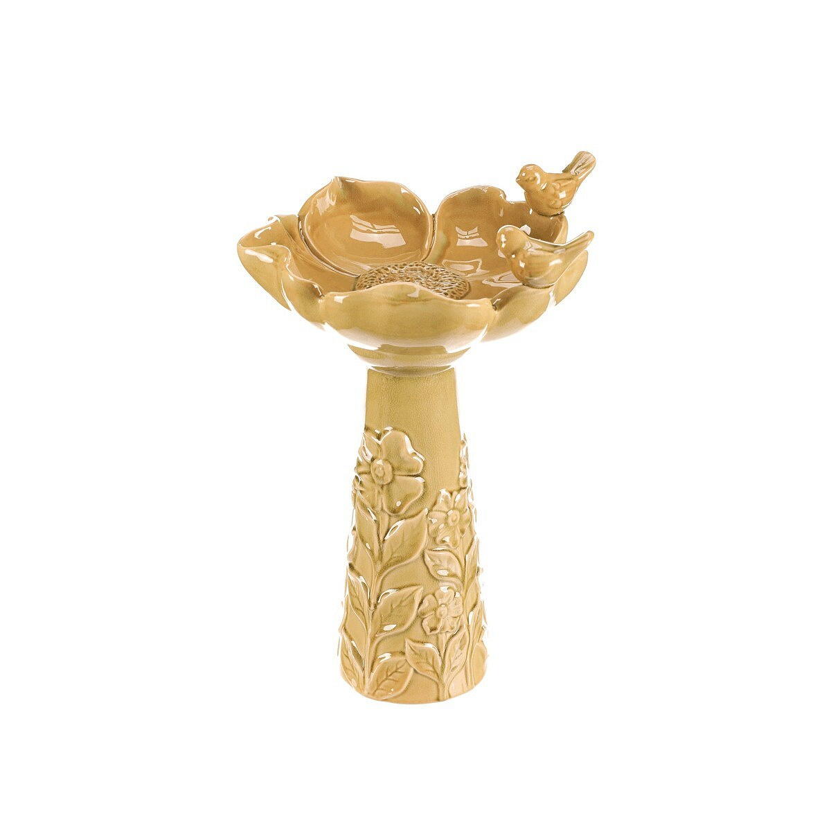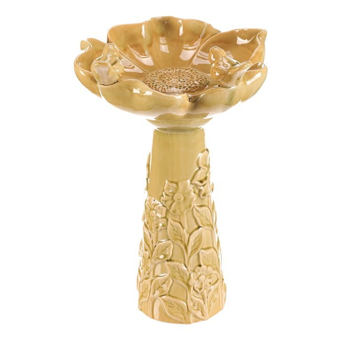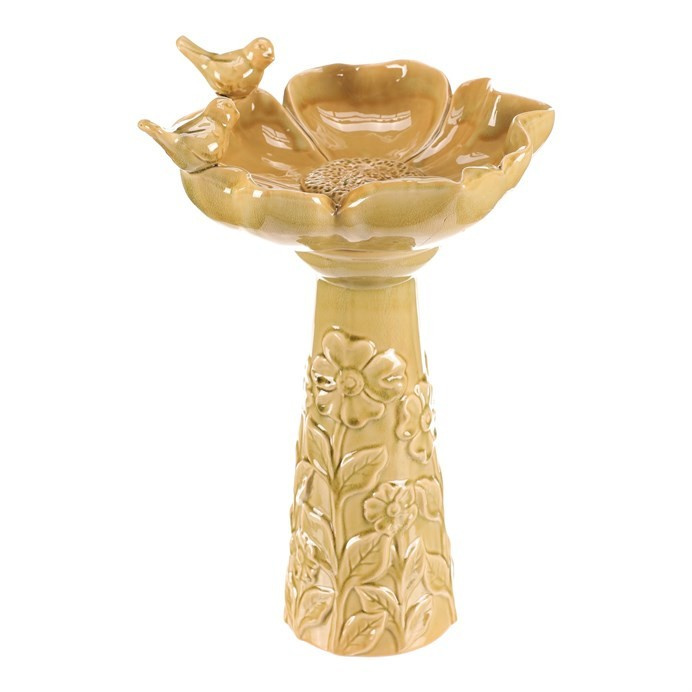Světle zeleně zbarvené keramické pítko pro ptáčky, ve tvaru květu na vysoké noze, je vznešenou zahradní dekorací, která přitahuje pozornost a přináší radost nejen ptáčkům, ale i lidem. Tvar velkého květu se dvěma pěvci, kteří se na něm natrvalo usadili, přidává do vašeho prostoru dokonalé oživení. Robustní keramická noha, kterou můžete snadno ukotvit pomocí otvoru na dně, je vysoce praktická a podtrhuje celkovou eleganci produktu. Takové pítko rozhodně bude dělat radost nejen vám, ale nadchne i vaše návštěvníky včetně všech kolemjdoucích, kteří se na chvíli zastaví, aby si užili jeho krásu.