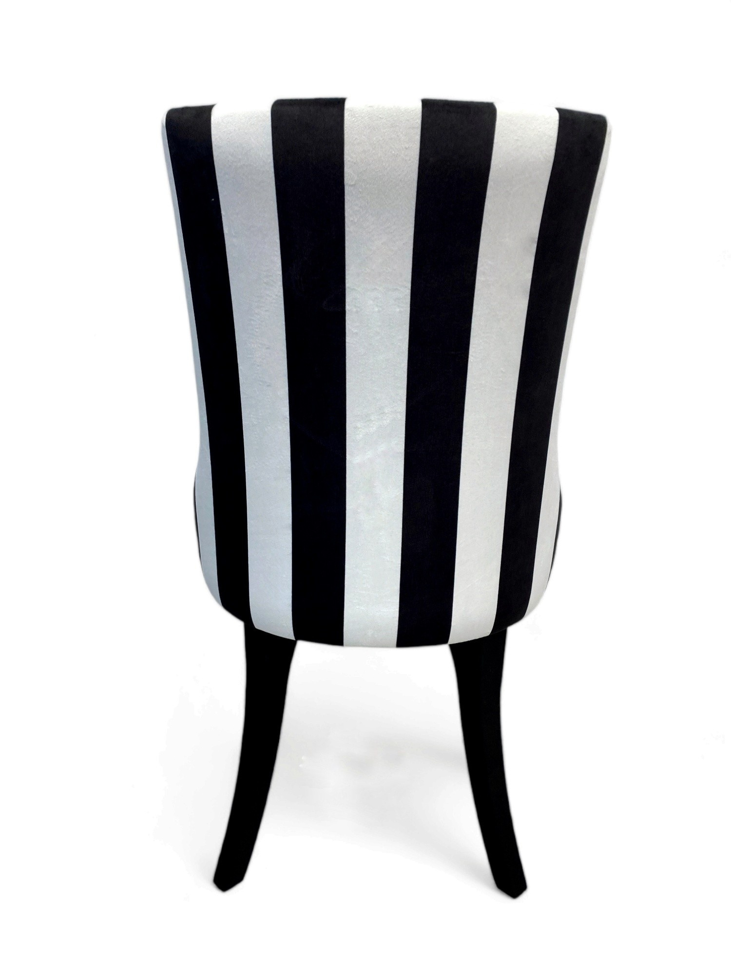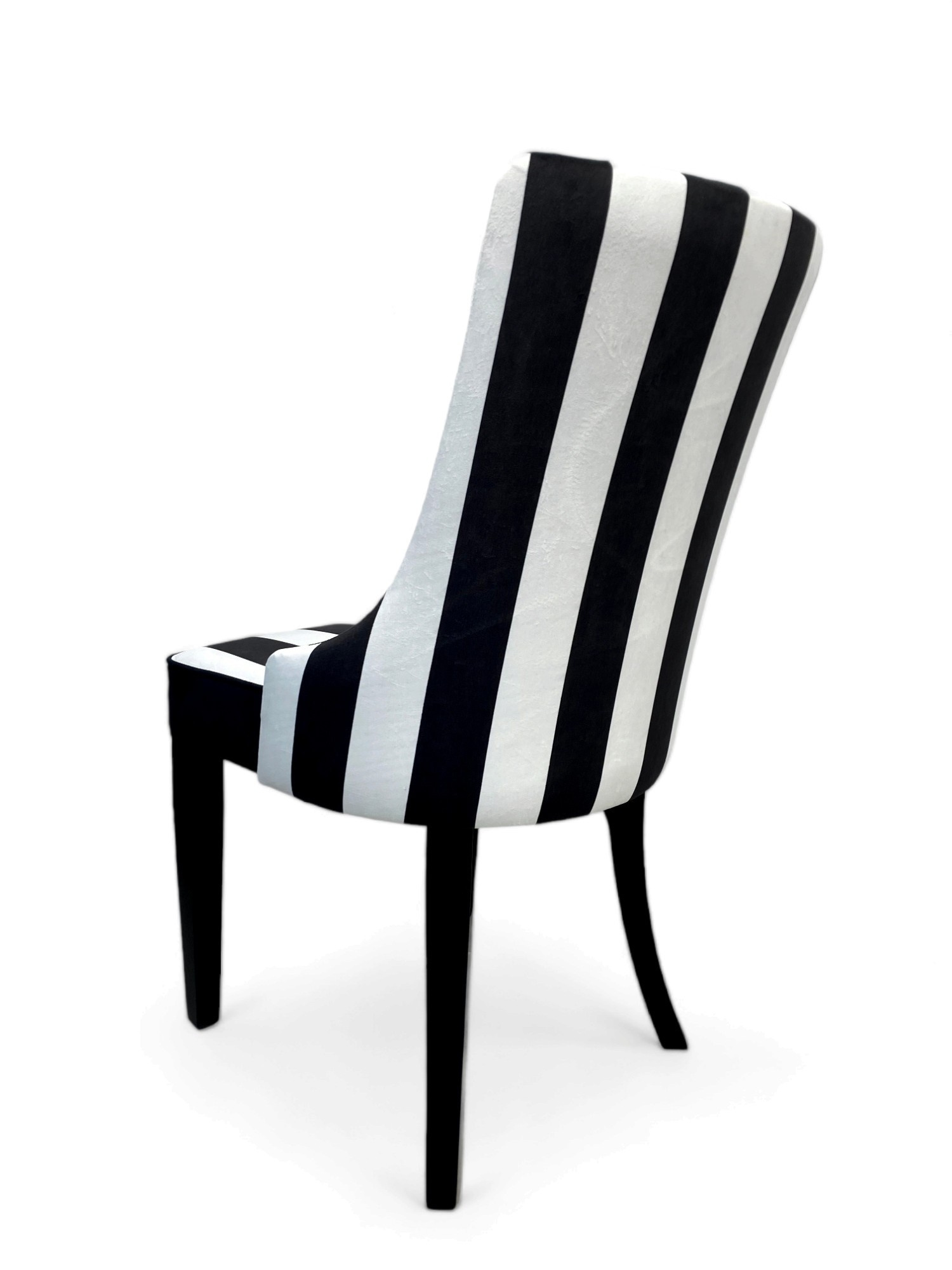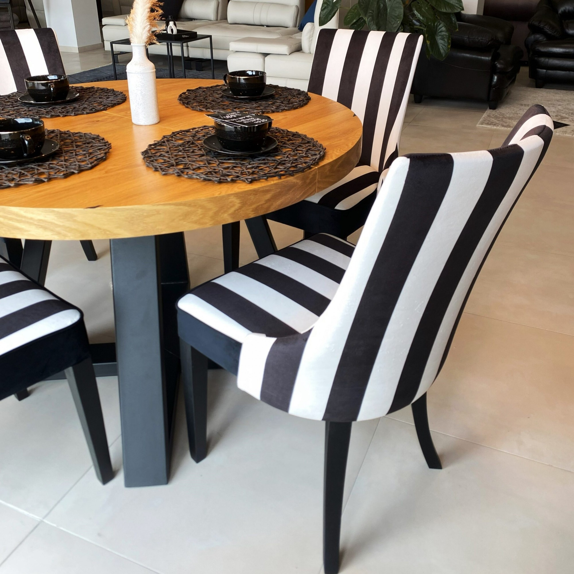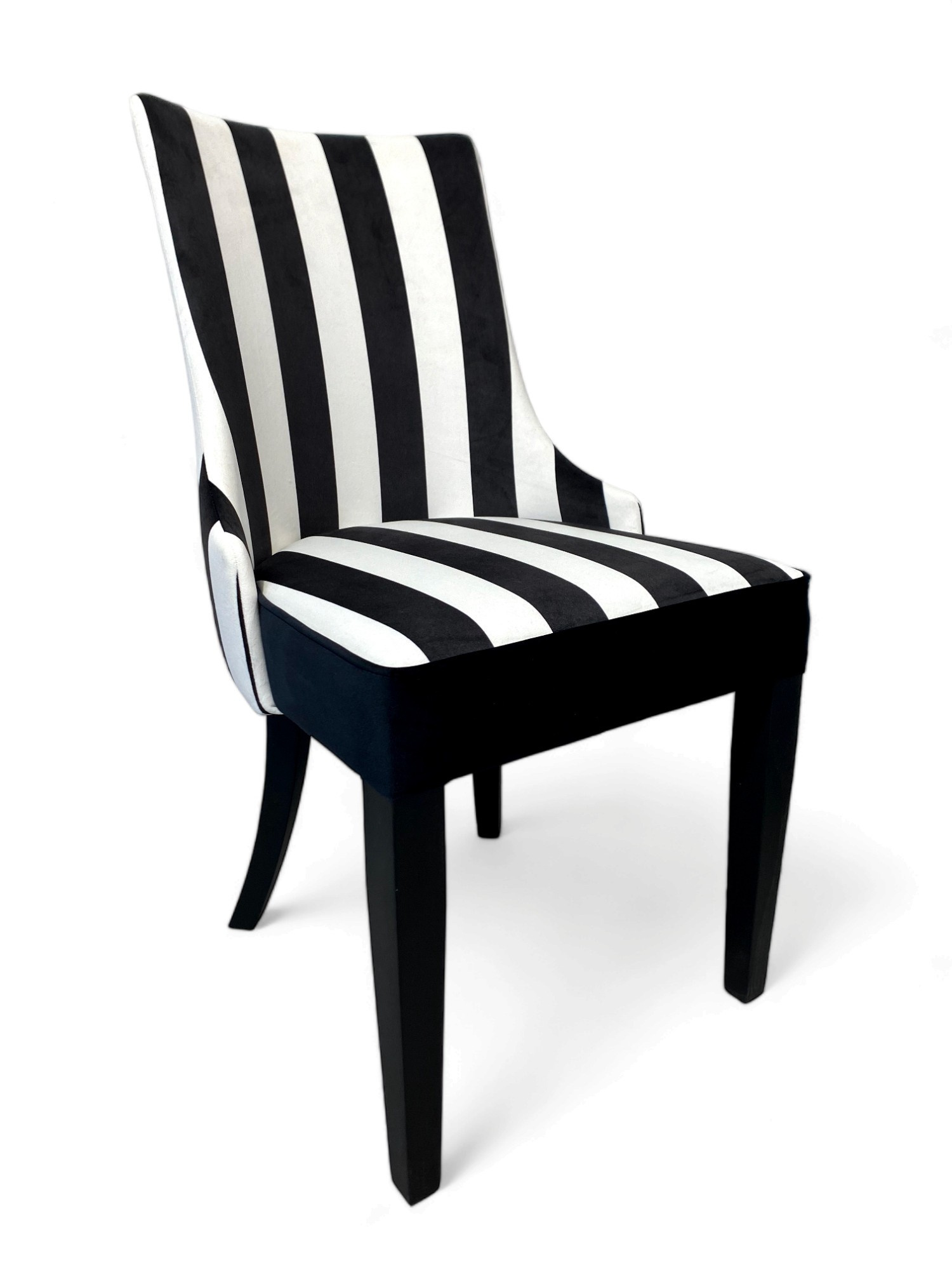Židle Karmen je výjimečný model pro osoby, které si cení moderního designu. Tkanina v černo-bílé pruhy podtrhuje elegantní charakter židle. \n \nSpecifikace: \n \n– Vysoce pružná HR pěna, \n– Dřevěné nohy. \n \nUvedená cena se vztahuje na 1 ks. židle. Dostupných 6 kusů.