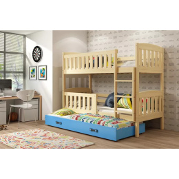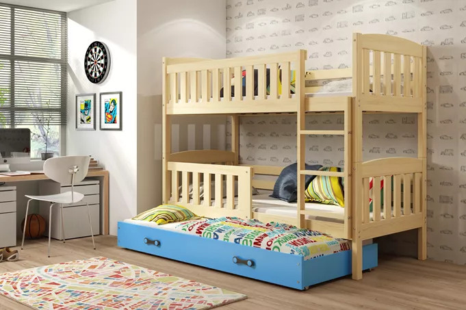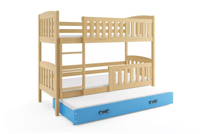 Dětská patrová postel KUBUS 3 s přistýlkou 90x200 cm, včetně matrací, Přírodní/Modrá