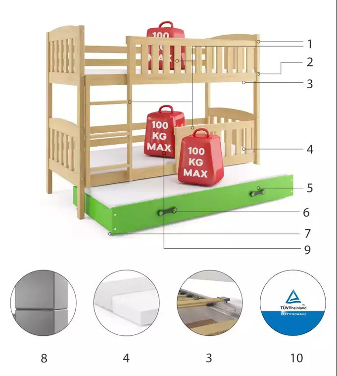 Dětská patrová postel KUBUS 3 s přistýlkou 90x200 cm, bez matrace, Přírodní/Zelená