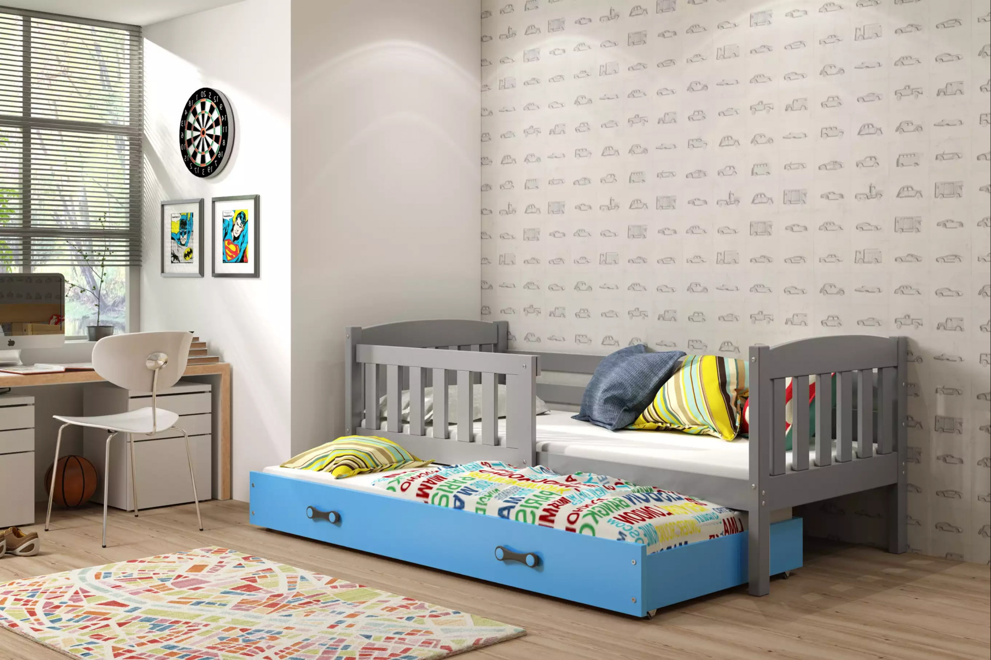 Dětská postel KUBUS s přistýlkou 90x200 cm, bez matrace, Grafit/Modrá