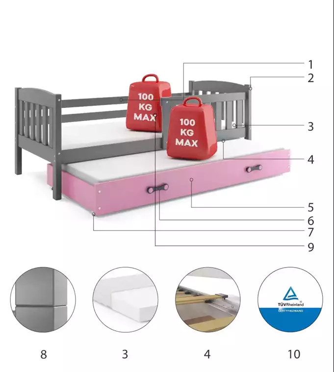 Dětská postel KUBUS s přistýlkou 80x190 cm, bez matrace, Grafit/Růžová