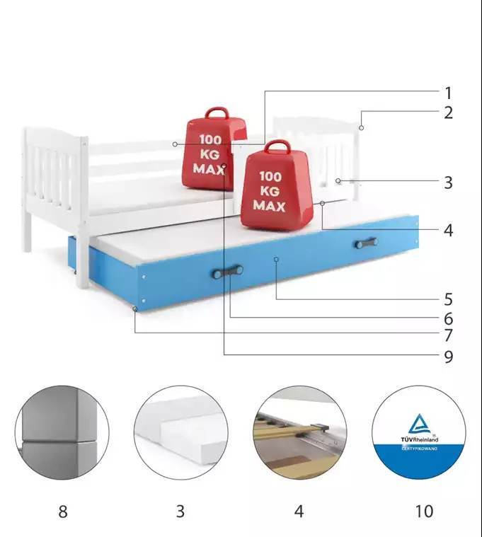 Dětská postel KUBUS s přistýlkou 90x200 cm, bez matrace, Bílá/Modrá