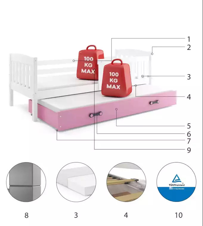 Dětská postel KUBUS s přistýlkou 90x200 cm, bez matrace, Bílá/Růžová