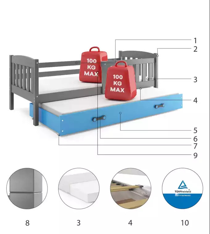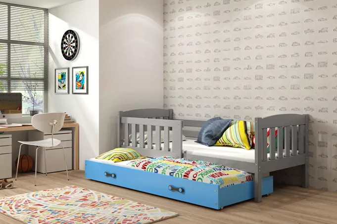 Dětská postel KUBUS s přistýlkou 80x190 cm, s matracemi, Grafit/Modrá