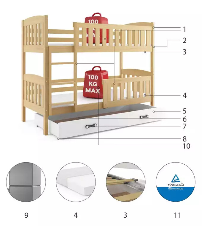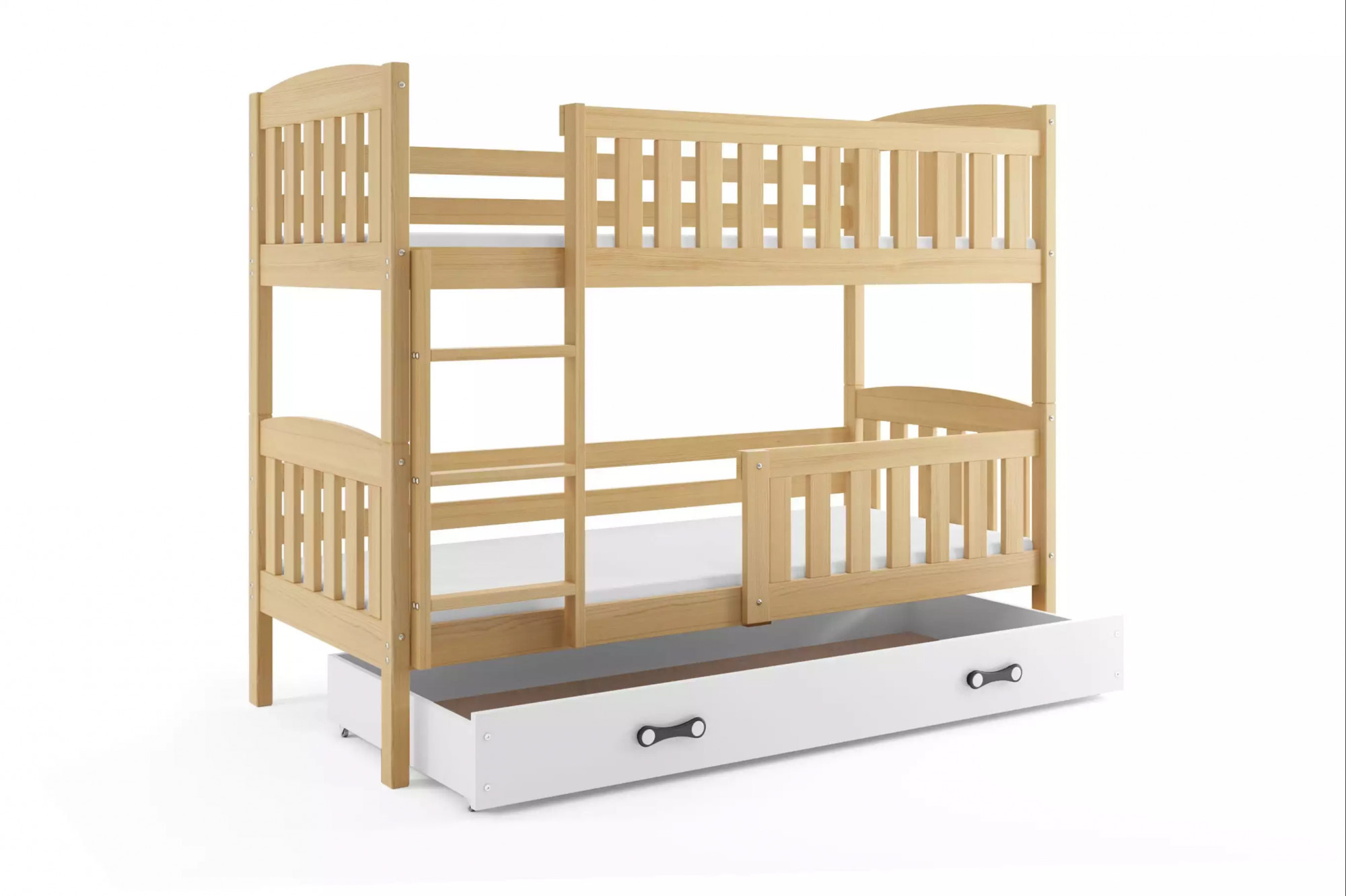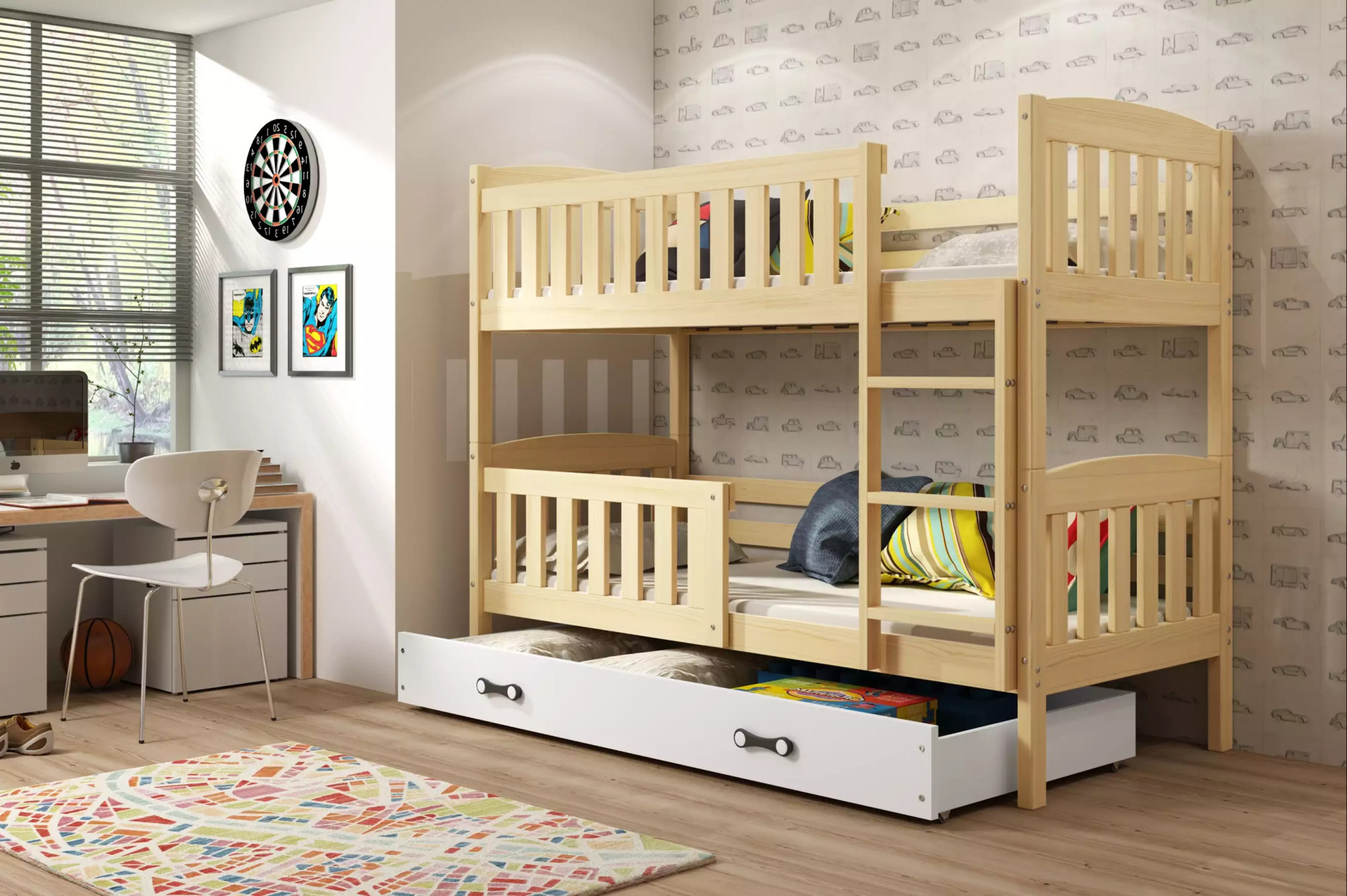 Dětská patrová postel KUBUS se šuplíkem 90x200 cm, včetně matrací, Přírodní/Bílá