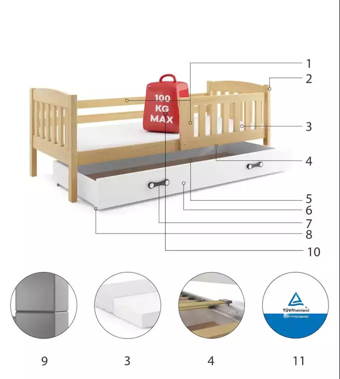 Dětská postel KUBUS 90x200 cm se šuplíkem, s matrací, Přírodní/Bílá