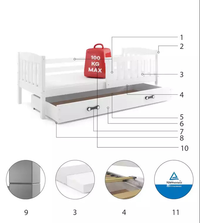 Dětská postel KUBUS 80x160 cm se šuplíkem, s matrací, Bílá/Bílá