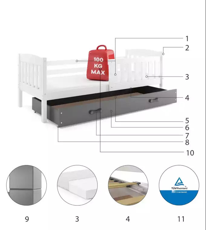 Dětská postel KUBUS 80x190 cm se šuplíkem, s matrací, Bílá/Grafit