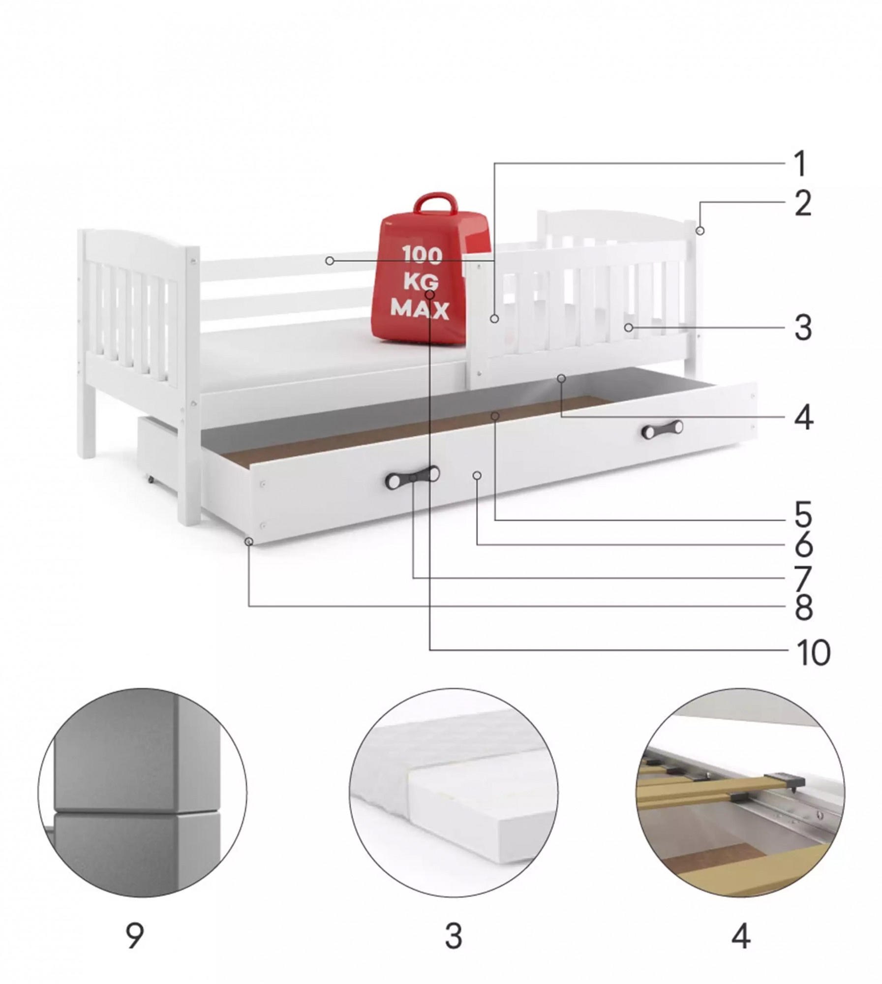 Dětská postel KUBUS 80x190 cm se šuplíkem, s matrací, Grafit/Bílá