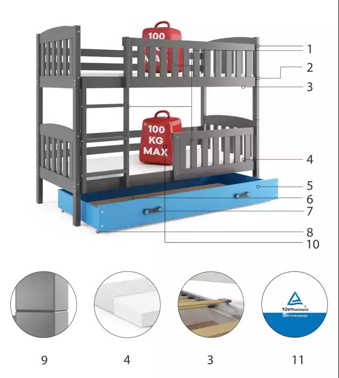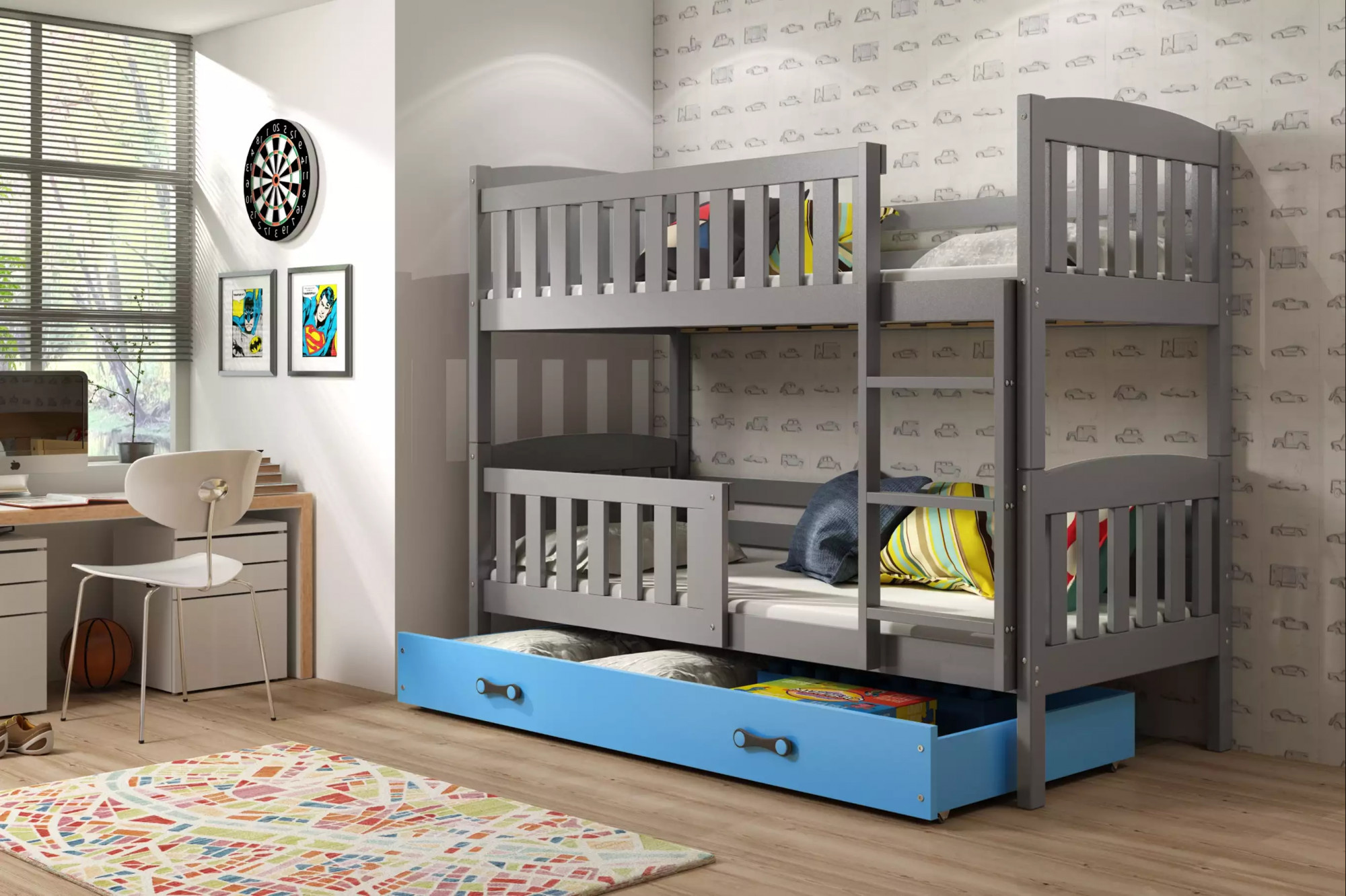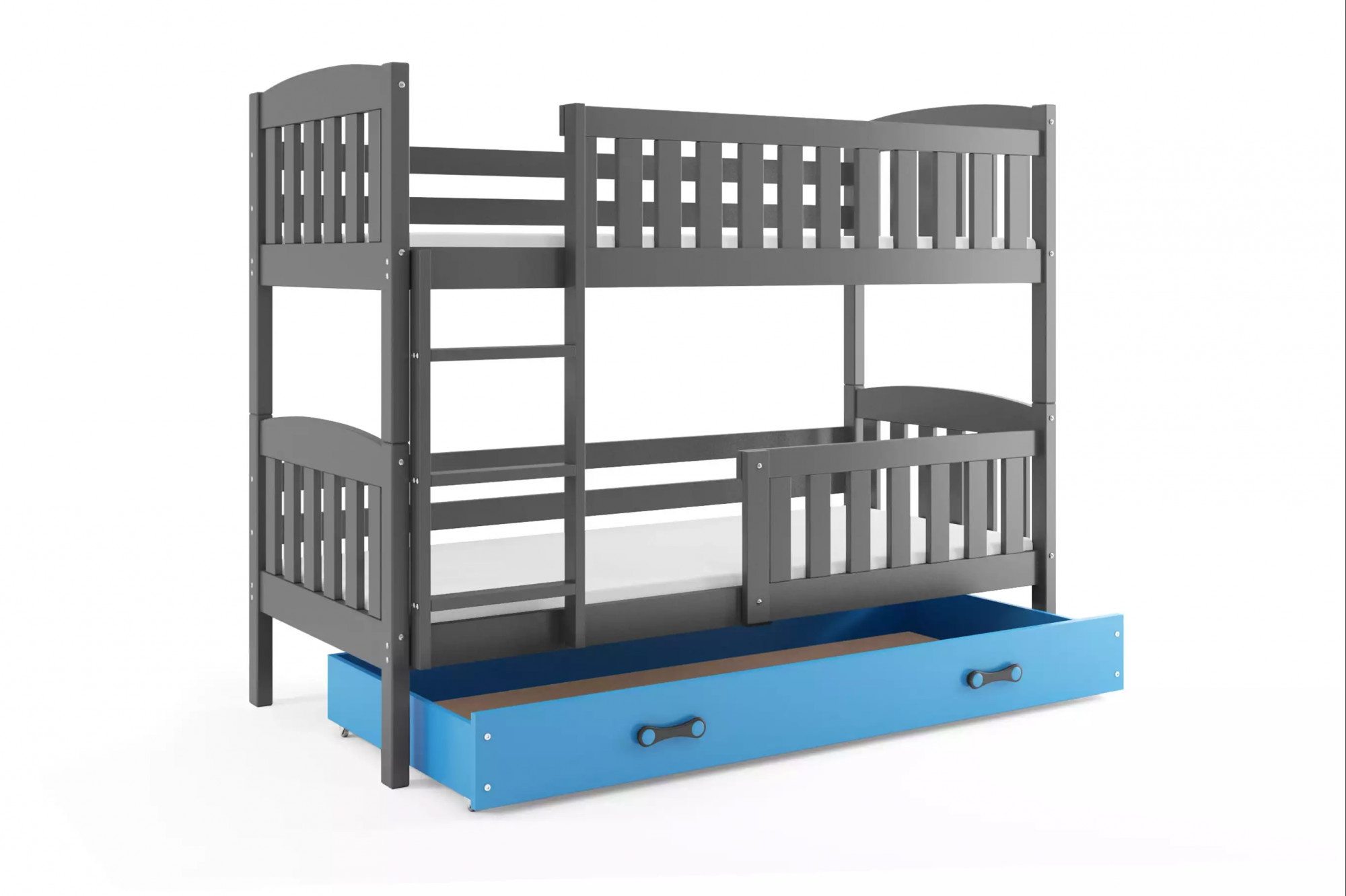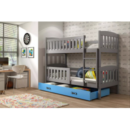 Dětská patrová postel KUBUS se šuplíkem 90x200 cm, včetně matrací, Grafit/Modrá
