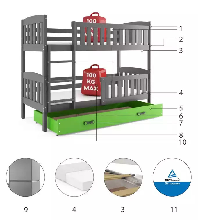Dětská patrová postel KUBUS se šuplíkem 90x200 cm, bez matrace, Grafit/Zelená