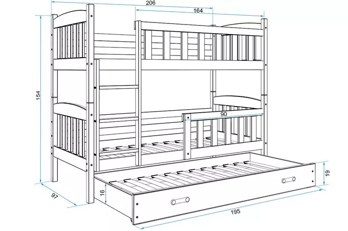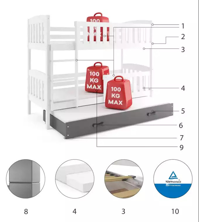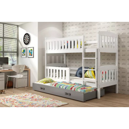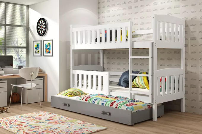 Dětská patrová postel KUBUS 3 s přistýlkou 90x200 cm, včetně matrací, Bílá/Grafit