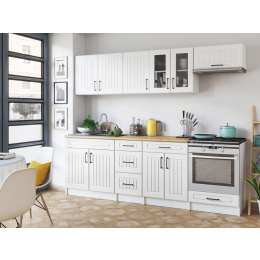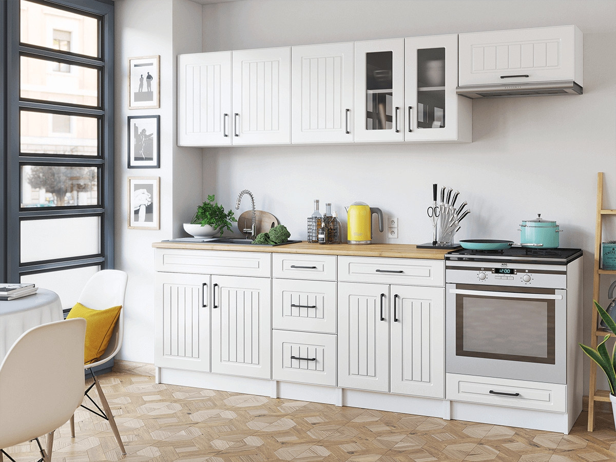 Kuchyňská linka Běla je vyrobená ve velmi oblíbeném venkovském stylu, který se hodí do kuchyně v paneláku i v rodinném domě. Tento styl má jedinečnou schopnost proměnit Vaši kuchyň v útulnou a zároveň funkční místnost, kde bude radost vařit i péct. Kuchyňská linka Běla nabízí dostatek úložného i pracovního prostoru. Všechny skříňky jsou samostatné, takže si je můžete sestavit tak, jak Vám to vyhovuje. Korpusy skříněk jsou vyrobené z lamina 18 mm s hranami ABS a dvířka jsou MDF 16mm. Všechny skříňky jsou dodávány v demontu. Součástí balení je montážní plánek včetně všech potřebných spojovacích materiálů. Cena je uvedena za sestavu vyobrazenou na úvodní fotografii BEZ PRACOVNÍ DESKY, s úchytkami, které jsou vyobrazeny v doplňkových fotografiích. Pracovní desku lze dokoupit nad každou skříňku zvlášť podle její šíře. Vyobrazené spotřebiče, dřez, baterie, doplňky a dekorace nejsou v ceně. Zobrazení barev na fotografii se může od skutečnosti lišit.