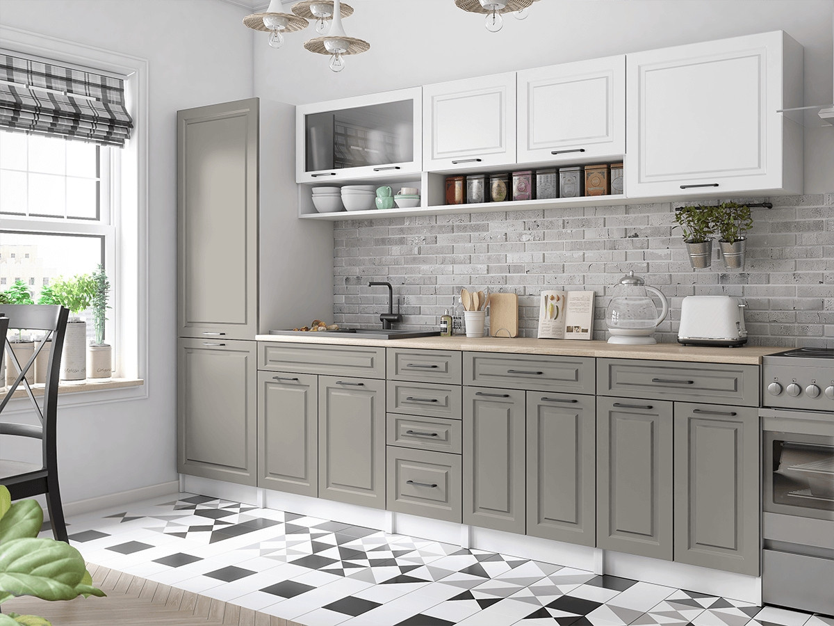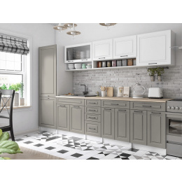 Kuchyňská linka Brigita je vyrobená ve venkovském stylu, který se hodí do kuchyně v paneláku i v rodinném domě. Tento styl má jedinečnou schopnost proměnit Vaši kuchyň v útulnou a zároveň funkční místnost, kde bude radost vařit i péct. Kuchyňská linka Brigita nabízí dostatek úložného i pracovního prostoru. Všechny skříňky jsou samostatné, takže si je můžete sestavit tak, jak Vám to vyhovuje. Korpusy skříněk jsou vyrobené z lamina 18 mm s hranami ABS a dvířka jsou MDF 16mm. Všechny skříňky jsou dodávány v demontu. Součástí balení je montážní plánek včetně všech potřebných spojovacích prvků. Cena je uvedena za sestavu vyobrazenou na úvodní fotografii BEZ PRACOVNÍ DESKY, s úchytkami, které jsou vyobrazeny v doplňkových fotografiích. Pracovní desku lze dokoupit nad každou skříňku zvlášť podle její šíře. Vyobrazené spotřebiče, dřez, baterie, doplňky a dekorace nejsou v ceně. Kuchyň bude dodaná s bílými korpusy a dvířky v kombinaci bílá a šedá. Zobrazení barev na fotografii se může od skutečnosti lišit.
