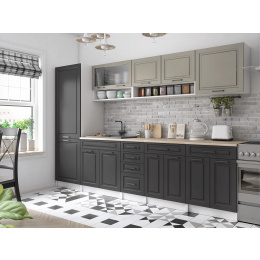 Kuchyňská linka Brigita je vyrobená ve venkovském stylu, který se hodí do kuchyně v paneláku i v rodinném domě. Tento styl má jedinečnou schopnost proměnit Vaši kuchyň v útulnou a zároveň funkční místnost, kde bude radost vařit i péct. Kuchyňská linka Brigita nabízí dostatek úložného i pracovního prostoru. Všechny skříňky jsou samostatné, takže si je můžete sestavit tak, jak Vám to vyhovuje. Korpusy skříněk jsou vyrobené z lamina 18 mm s hranami ABS a dvířka jsou MDF 16mm. Všechny skříňky jsou dodávány v demontu. Součástí balení je montážní plánek včetně všech potřebných spojovacích prvků. Cena je uvedena za sestavu vyobrazenou na úvodní fotografii BEZ PRACOVNÍ DESKY, s úchytkami, které jsou vyobrazeny v doplňkových fotografiích. Pracovní desku lze dokoupit nad každou skříňku zvlášť podle její šíře. Vyobrazené spotřebiče, dřez, baterie, doplňky a dekorace nejsou v ceně. Kuchyň bude dodaná s bílými korpusy a dvířky v kombinaci šedá a grafit. Zobrazení barev na fotografii se může od skutečnosti lišit.