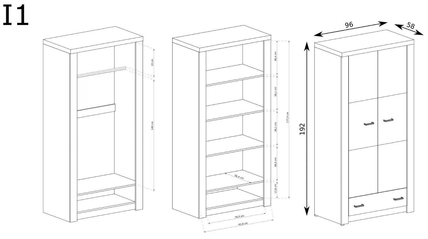 Jednoduchá, velká dvoudveřová šatní skříň s kovovými úchytkami. Obsahuje zásuvku hlubokou 58 cm. Součástí skříně je také tyč o délce 92 cm, která je ideální pro využití dostupného prostoru, zavěšení oblečení a organizaci. Tato skříň jistě zaplní prázdný prostor v naší domácnosti, vytvoříme s ní mnoho zajímavých aranžmá a překvapíme hosty jejím originálním střihem. K dostání ve třech barvách.