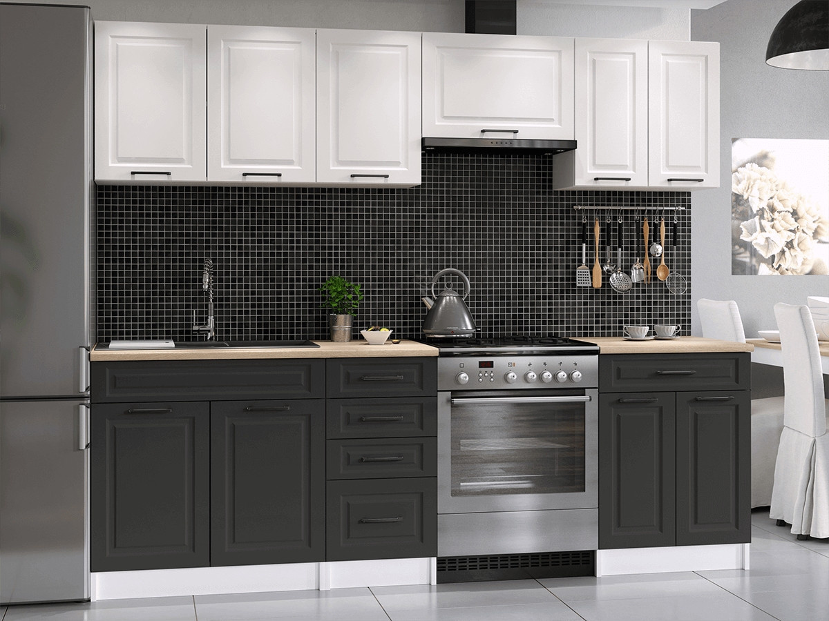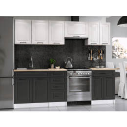 Kuchyňská linka Ilona je vyrobená ve venkovském stylu, který se hodí do kuchyně v paneláku i v rodinném domě. Tento styl má jedinečnou schopnost proměnit Vaši kuchyň v útulnou a zároveň funkční místnost, kde bude radost vařit i péct. Kuchyňská linka Ilona nabízí dostatek úložného i pracovního prostoru. Všechny skříňky jsou samostatné, takže si je můžete sestavit tak, jak Vám to vyhovuje. Korpusy skříněk jsou vyrobené z lamina 18 mm s hranami ABS a dvířka jsou MDF 16mm. Všechny skříňky jsou dodávány v demontu. Součástí balení je montážní plánek včetně všech potřebných spojovacích prvků. Cena je uvedna za sestavu vyobrazenou na úvodní fotografii BEZ PRACOVNÍ DESKY, s úchytkami, které jsou vyobrazeny v doplňkových fotografiích. Pracovní desku lze dokoupit nad každou skříňku zvlášť podle její šíře. Vyobrazené spotřebiče, dřez, baterie, doplňky a dekorace nejsou v ceně. Kuchyň bude dodaná s bílými korpusy a dvířky v kombinaci bílá a grafit. Zobrazení barev na fotografii se může od skutečnosti lišit.