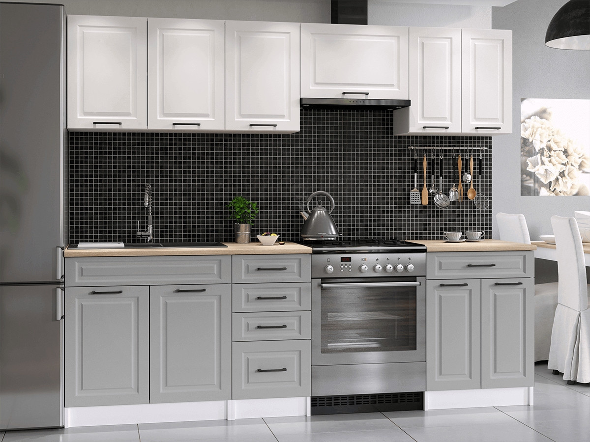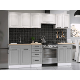 Kuchyňská linka Ilona je vyrobená ve venkovském stylu, který se hodí do kuchyně v paneláku i v rodinném domě. Tento styl má jedinečnou schopnost proměnit Vaši kuchyň v útulnou a zároveň funkční místnost, kde bude radost vařit i péct. Kuchyňská linka Ilona nabízí dostatek úložného i pracovního prostoru. Všechny skříňky jsou samostatné, takže si je můžete sestavit tak, jak Vám to vyhovuje. Korpusy skříněk jsou vyrobené z lamina 18 mm s hranami ABS a dvířka jsou MDF 16mm. Všechny skříňky jsou dodávány v demontu. Součástí balení je montážní plánek včetně všech potřebných spojovacích prvků. Cena je uvedna za sestavu vyobrazenou na úvodní fotografii BEZ PRACOVNÍ DESKY, s úchytkami, které jsou vyobrazeny v doplňkových fotografiích. Pracovní desku lze dokoupit nad každou skříňku zvlášť podle její šíře. Vyobrazené spotřebiče, dřez, baterie, doplňky a dekorace nejsou v ceně. Kuchyň bude dodaná s bílými korpusy a dvířky v kombinaci bílá a šedá. Zobrazení barev na fotografii se může od skutečnosti lišit.
