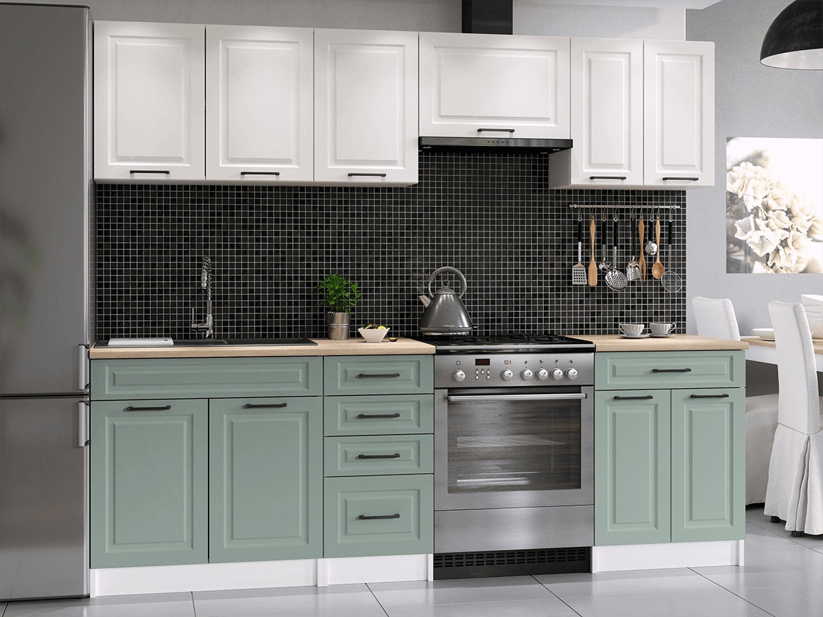 Kuchyňská linka Ilona je vyrobená ve venkovském stylu, který se hodí do kuchyně v paneláku i v rodinném domě. Tento styl má jedinečnou schopnost proměnit Vaši kuchyň v útulnou a zároveň funkční místnost, kde bude radost vařit i péct. Kuchyňská linka Ilona nabízí dostatek úložného i pracovního prostoru. Všechny skříňky jsou samostatné, takže si je můžete sestavit tak, jak Vám to vyhovuje. Korpusy skříněk jsou vyrobené z lamina 18 mm s hranami ABS a dvířka jsou MDF 16mm. Všechny skříňky jsou dodávány v demontu. Součástí balení je montážní plánek včetně všech potřebných spojovacích prvků. Cena je uvedna za sestavu vyobrazenou na úvodní fotografii BEZ PRACOVNÍ DESKY, s úchytkami, které jsou vyobrazeny v doplňkových fotografiích. Pracovní desku lze dokoupit nad každou skříňku zvlášť podle její šíře. Vyobrazené spotřebiče, dřez, baterie, doplňky a dekorace nejsou v ceně. Kuchyň bude dodaná s bílými korpusy a dvířky v kombinaci bílá a světle zelená. Zobrazení barev na fotografii se může od skutečnosti lišit.