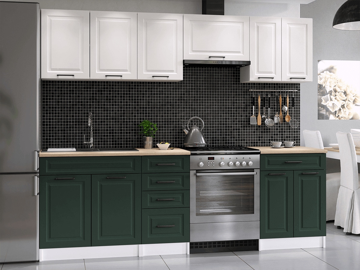 Kuchyňská linka Ilona je vyrobená ve venkovském stylu, který se hodí do kuchyně v paneláku i v rodinném domě. Tento styl má jedinečnou schopnost proměnit Vaši kuchyň v útulnou a zároveň funkční místnost, kde bude radost vařit i péct. Kuchyňská linka Ilona nabízí dostatek úložného i pracovního prostoru. Všechny skříňky jsou samostatné, takže si je můžete sestavit tak, jak Vám to vyhovuje. Korpusy skříněk jsou vyrobené z lamina 18 mm s hranami ABS a dvířka jsou MDF 16mm. Všechny skříňky jsou dodávány v demontu. Součástí balení je montážní plánek včetně všech potřebných spojovacích prvků. Cena je uvedna za sestavu vyobrazenou na úvodní fotografii BEZ PRACOVNÍ DESKY, s úchytkami, které jsou vyobrazeny v doplňkových fotografiích. Pracovní desku lze dokoupit nad každou skříňku zvlášť podle její šíře. Vyobrazené spotřebiče, dřez, baterie, doplňky a dekorace nejsou v ceně. Kuchyň bude dodaná s bílými korpusy a dvířky v kombinaci bílá a tmavě zelená. Zobrazení barev na fotografii se může od skutečnosti lišit.