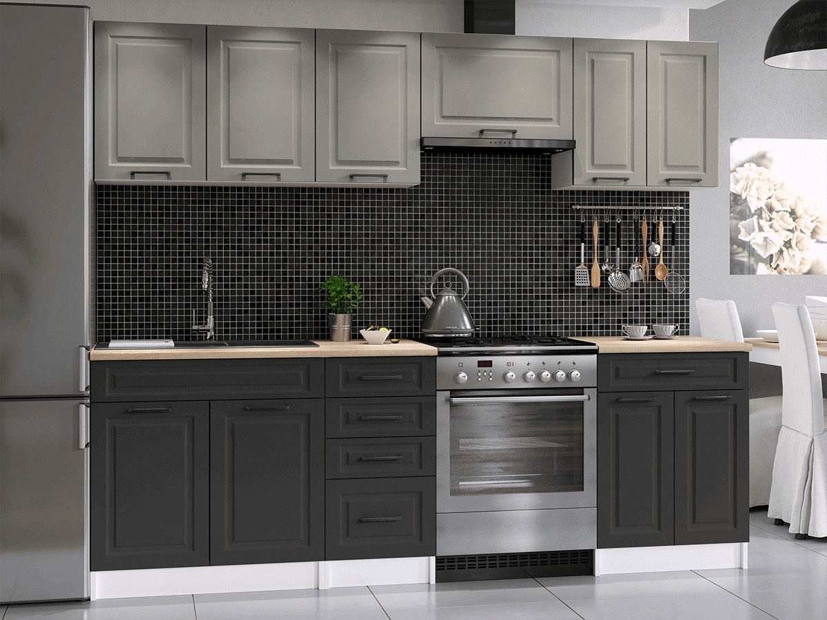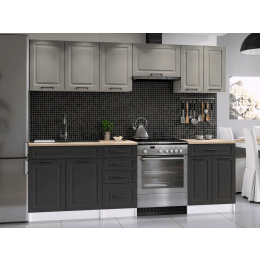 Kuchyňská linka Ilona je vyrobená ve venkovském stylu, který se hodí do kuchyně v paneláku i v rodinném domě. Tento styl má jedinečnou schopnost proměnit Vaši kuchyň v útulnou a zároveň funkční místnost, kde bude radost vařit i péct. Kuchyňská linka Ilona nabízí dostatek úložného i pracovního prostoru. Všechny skříňky jsou samostatné, takže si je můžete sestavit tak, jak Vám to vyhovuje. Korpusy skříněk jsou vyrobené z lamina 18 mm s hranami ABS a dvířka jsou MDF 16mm. Všechny skříňky jsou dodávány v demontu. Součástí balení je montážní plánek včetně všech potřebných spojovacích prvků. Cena je uvedna za sestavu vyobrazenou na úvodní fotografii BEZ PRACOVNÍ DESKY, s úchytkami, které jsou vyobrazeny v doplňkových fotografiích. Pracovní desku lze dokoupit nad každou skříňku zvlášť podle její šíře. Vyobrazené spotřebiče, dřez, baterie, doplňky a dekorace nejsou v ceně. Kuchyň bude dodaná s bílými korpusy a dvířky v kombinaci světle šedá a grafit. Zobrazení barev na fotografii se může od skutečnosti lišit.