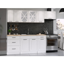 Kuchyňská linka Magda je vyrobená ve venkovském stylu, který se hodí do kuchyně v paneláku i v rodinném domě. Tento styl má jedinečnou schopnost proměnit Vaši kuchyň v útulnou a zároveň funkční místnost, kde bude radost vařit i péct. Kuchyňská linka Magda nabízí dostatek úložného i pracovního prostoru. Všechny skříňky jsou samostatné, takže si je můžete sestavit tak, jak Vám to vyhovuje. Korpusy skříněk jsou vyrobené z lamina 18 mm s hranami ABS a dvířka jsou MDF 16mm. Všechny skříňky jsou dodávány v demontu. Součástí balení je montážní plánek včetně všech potřebných spojovacích prvků. Cena je uvedna za sestavu vyobrazenou na úvodní fotografii BEZ PRACOVNÍ DESKY, s úchytkami, které jsou vyobrazeny v doplňkových fotografiích. Pracovní desku lze dokoupit nad každou skříňku zvlášť podle její šíře. Vyobrazené spotřebiče, dřez, baterie, doplňky a dekorace nejsou v ceně. Kuchyň bude dodaná s bílými korpusy a šedými dvířky. Zobrazení barev na fotografii se může od skutečnosti lišit.