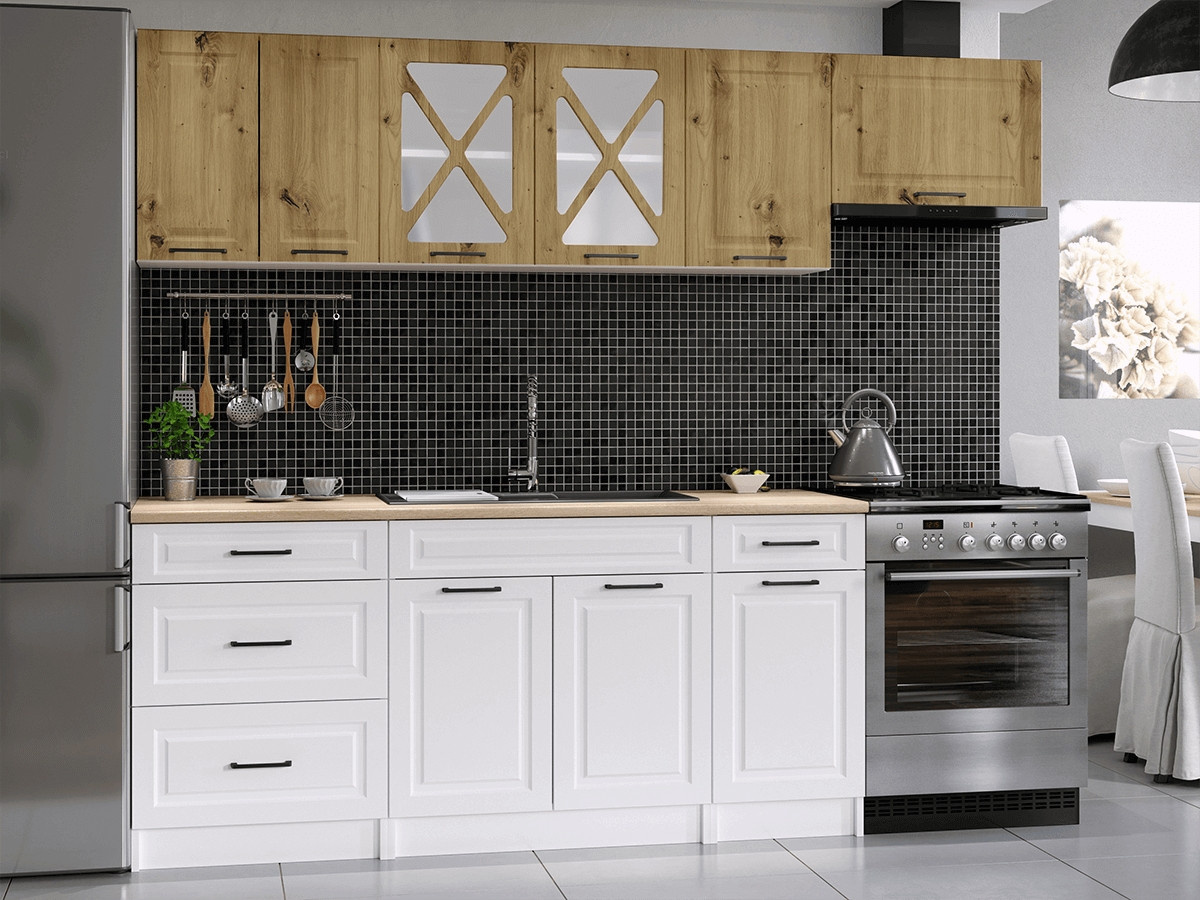 Kuchyňská linka Magda je vyrobená ve venkovském stylu, který se hodí do kuchyně v paneláku i v rodinném domě. Tento styl má jedinečnou schopnost proměnit Vaši kuchyň v útulnou a zároveň funkční místnost, kde bude radost vařit i péct. Kuchyňská linka Magda nabízí dostatek úložného i pracovního prostoru. Všechny skříňky jsou samostatné, takže si je můžete sestavit tak, jak Vám to vyhovuje. Korpusy skříněk jsou vyrobené z lamina 18 mm s hranami ABS a dvířka jsou MDF 16mm. Všechny skříňky jsou dodávány v demontu. Součástí balení je montážní plánek včetně všech potřebných spojovacích prvků. Cena je uvedna za sestavu vyobrazenou na úvodní fotografii BEZ PRACOVNÍ DESKY, s úchytkami, které jsou vyobrazeny v doplňkových fotografiích. Pracovní desku lze dokoupit nad každou skříňku zvlášť podle její šíře. Vyobrazené spotřebiče, dřez, baterie, doplňky a dekorace nejsou v ceně. Kuchyň bude dodaná s bílými korpusy a dvířky v odstínu artisan a bílá. Zobrazení barev na fotografii se může od skutečnosti lišit.