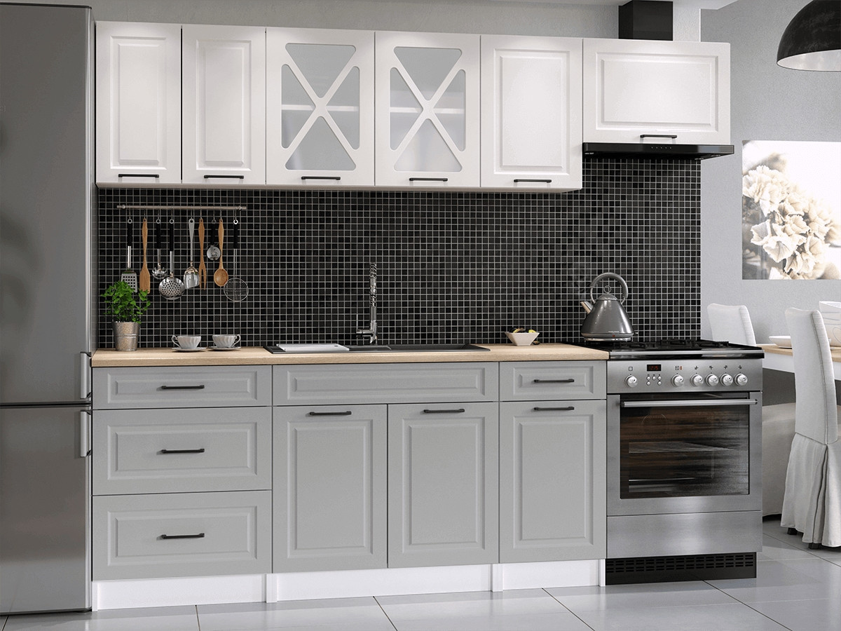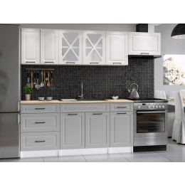 Kuchyňská linka Magda je vyrobená ve venkovském stylu, který se hodí do kuchyně v paneláku i v rodinném domě. Tento styl má jedinečnou schopnost proměnit Vaši kuchyň v útulnou a zároveň funkční místnost, kde bude radost vařit i péct. Kuchyňská linka Magda nabízí dostatek úložného i pracovního prostoru. Všechny skříňky jsou samostatné, takže si je můžete sestavit tak, jak Vám to vyhovuje. Korpusy skříněk jsou vyrobené z lamina 18 mm s hranami ABS a dvířka jsou MDF 16mm. Všechny skříňky jsou dodávány v demontu. Součástí balení je montážní plánek včetně všech potřebných spojovacích prvků. Cena je uvedna za sestavu vyobrazenou na úvodní fotografii BEZ PRACOVNÍ DESKY, s úchytkami, které jsou vyobrazeny v doplňkových fotografiích. Pracovní desku lze dokoupit nad každou skříňku zvlášť podle její šíře. Vyobrazené spotřebiče, dřez, baterie, doplňky a dekorace nejsou v ceně. Kuchyň bude dodaná s bílými korpusy a dvířky v kombinaci bílá a šedá. Zobrazení barev na fotografii se může od skutečnosti lišit.