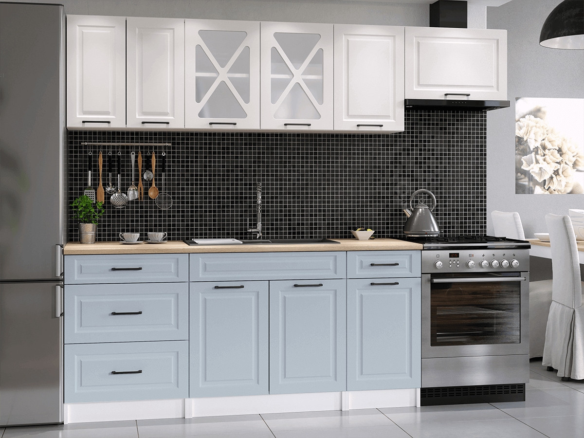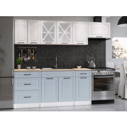 Kuchyňská linka Magda je vyrobená ve venkovském stylu, který se hodí do kuchyně v paneláku i v rodinném domě. Tento styl má jedinečnou schopnost proměnit Vaši kuchyň v útulnou a zároveň funkční místnost, kde bude radost vařit i péct. Kuchyňská linka Magda nabízí dostatek úložného i pracovního prostoru. Všechny skříňky jsou samostatné, takže si je můžete sestavit tak, jak Vám to vyhovuje. Korpusy skříněk jsou vyrobené z lamina 18 mm s hranami ABS a dvířka jsou MDF 16mm. Všechny skříňky jsou dodávány v demontu. Součástí balení je montážní plánek včetně všech potřebných spojovacích prvků. Cena je uvedna za sestavu vyobrazenou na úvodní fotografii BEZ PRACOVNÍ DESKY, s úchytkami, které jsou vyobrazeny v doplňkových fotografiích. Pracovní desku lze dokoupit nad každou skříňku zvlášť podle její šíře. Vyobrazené spotřebiče, dřez, baterie, doplňky a dekorace nejsou v ceně. Kuchyň bude dodaná s bílými korpusy a dvířky v kombinaci bílá a světle modrá. Zobrazení barev na fotografii se může od skutečnosti lišit.