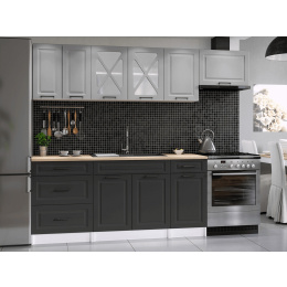 Kuchyňská linka Magda je vyrobená ve venkovském stylu, který se hodí do kuchyně v paneláku i v rodinném domě. Tento styl má jedinečnou schopnost proměnit Vaši kuchyň v útulnou a zároveň funkční místnost, kde bude radost vařit i péct. Kuchyňská linka Magda nabízí dostatek úložného i pracovního prostoru. Všechny skříňky jsou samostatné, takže si je můžete sestavit tak, jak Vám to vyhovuje. Korpusy skříněk jsou vyrobené z lamina 18 mm s hranami ABS a dvířka jsou MDF 16mm. Všechny skříňky jsou dodávány v demontu. Součástí balení je montážní plánek včetně všech potřebných spojovacích prvků. Cena je uvedna za sestavu vyobrazenou na úvodní fotografii BEZ PRACOVNÍ DESKY, s úchytkami, které jsou vyobrazeny v doplňkových fotografiích. Pracovní desku lze dokoupit nad každou skříňku zvlášť podle její šíře. Vyobrazené spotřebiče, dřez, baterie, doplňky a dekorace nejsou v ceně. Kuchyň bude dodaná s bílými korpusy a dvířky v kombinaci šedá a grafit. Zobrazení barev na fotografii se může od skutečnosti lišit.